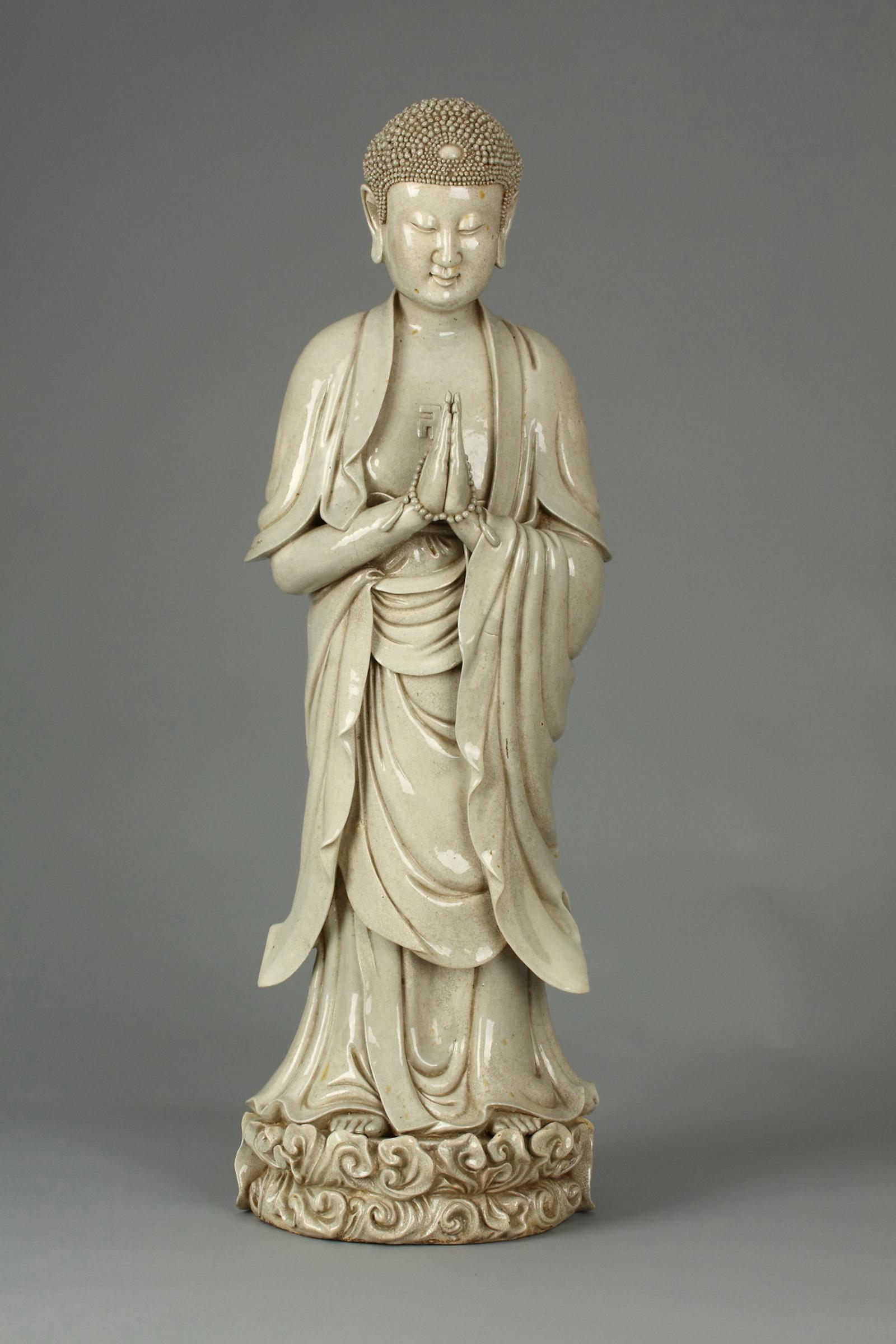 文物特点:宽27.5厘米 高83厘米。如来螺发,正面髻珠,眼脸低垂,双耳垂肩,面容端庄丰满,略含笑意,神态慈祥静穆,袒胸,胸前饰“卍”纹,身着袈裟,下着曳地长裙,施合掌印,掌上挂一串念珠,跣足立于浪座。通体施灰青釉,釉面开细冰裂纹,莹润光亮,像内中空,无釉,座底露胎,正中一圆孔,孔上横刻“开元寺”三字,两旁分别刻“大明嘉靖丙辰年漳州府,澄海县南门外海村乡信士陈长春百叩”楷体铭文。