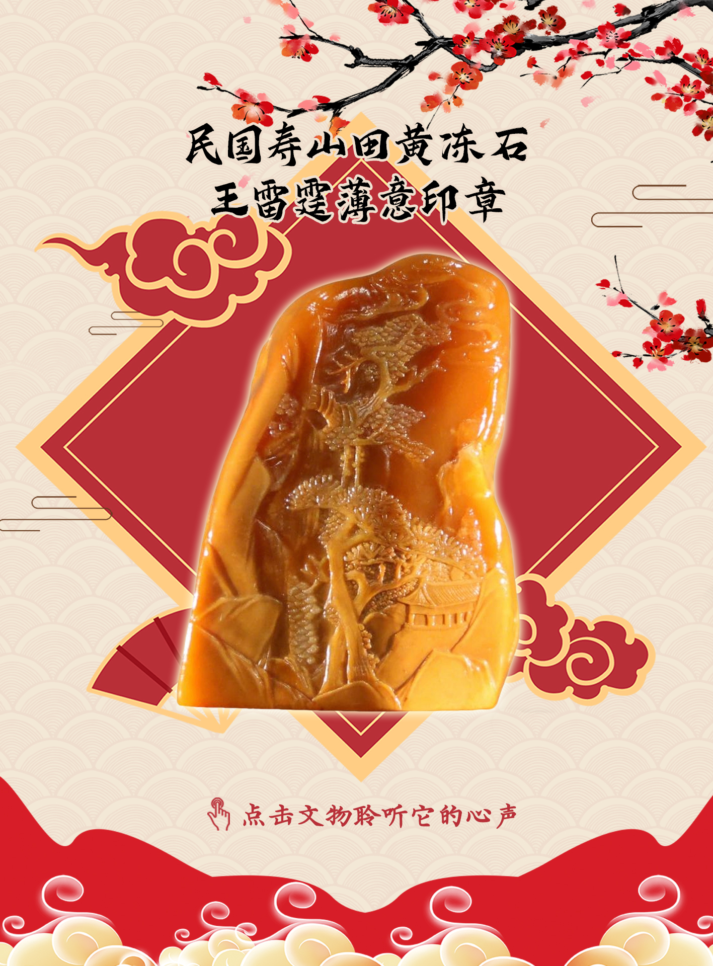 我由匠人王雷霆精雕而成,金蟾望月,蝙蝠翱翔,侧身诗句正是此景的生动解析,作为寿山石中的瑰宝,我肌理如蜜,澄澈通灵。自明代被发现,便与文人气节相系;既承载过清宫御赏的荣光,也浸润了福州“鬼市”的烟火气。如今静立馆中,述说着“寿山石”的千年雅韵。