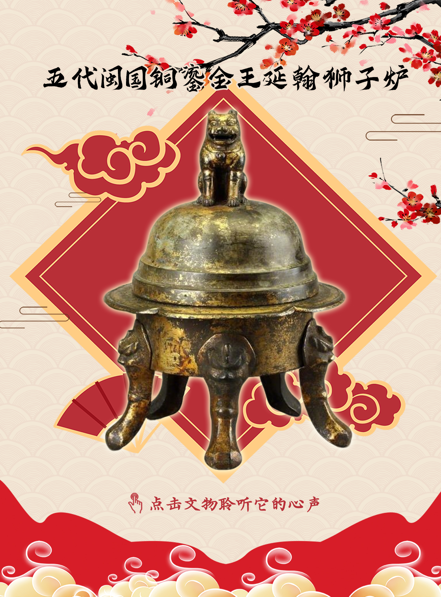 我诞生于五代十国的动荡间,身披鎏金,静吐云烟。一缕香,穿过狮首,漫过千年,那是王延翰为病中父亲祈祷的孝心,是一个王朝在胎动前最柔软的呼吸。我见证了一个王朝的兴起与骤变,但比王权更坚韧的,是这片土地上对“福”的虔诚守护。而今,人间香火不灭,当您俯身,千年的祝愿随烟掠过鼻息,化作闽地晨昏里可呼吸的福气。