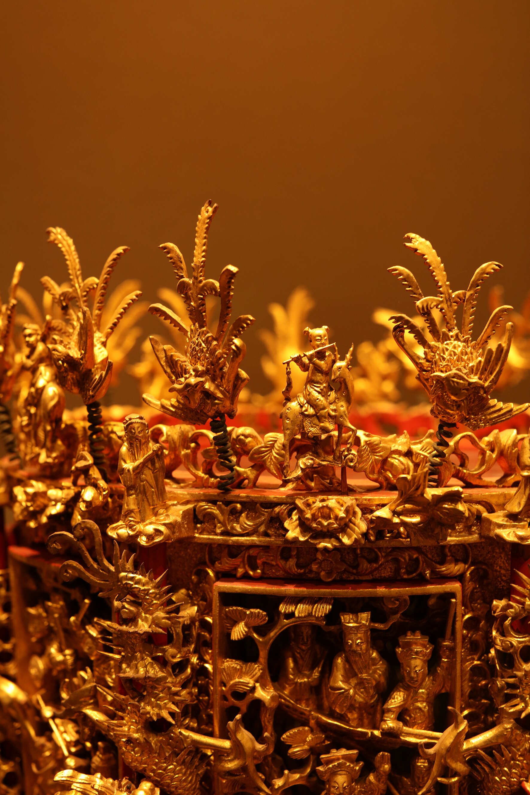 而一旁金漆木雕果盒,故事在精巧的透雕里流转。它盛满蜜饯鲜果,于春节期间供奉于神龛祖先前,漆光流转着百年前桐油的微光。