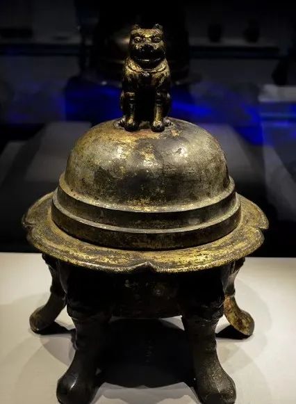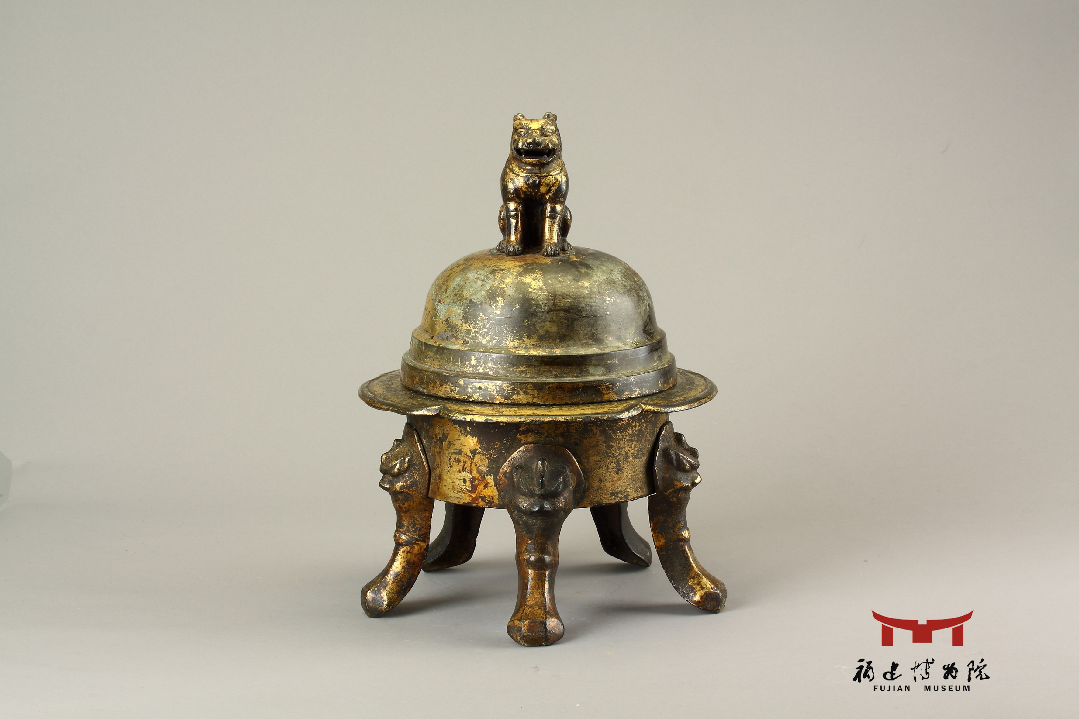 福建博物院藏有一件五代时期王延翰为父亲闽王王审知祈福而铸造的铜鎏金狮子炉,这是一件焚香器,整体鎏金,由盖、身两部分组成。炉盖上蹲着一只狮子,张口翘首,栩栩如生,狮口与器内相通,便于烟香外熏。宽折沿平面刻有一周楷书铭文:“弟子盐铁出使巡官、主福建院事、检校尚书、礼部郎中、赐紫金鱼袋王延翰,奉为大王及国夫人铸造师子香炉壹口,舍入保福院,永充供养。天祐四年九月四日题。”这是五代闽国有铭文铸器的一件孤品,是研究闽国文化的珍品。