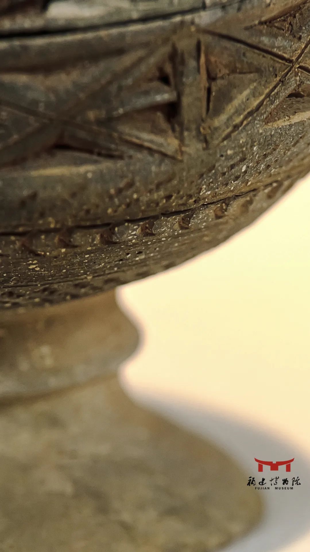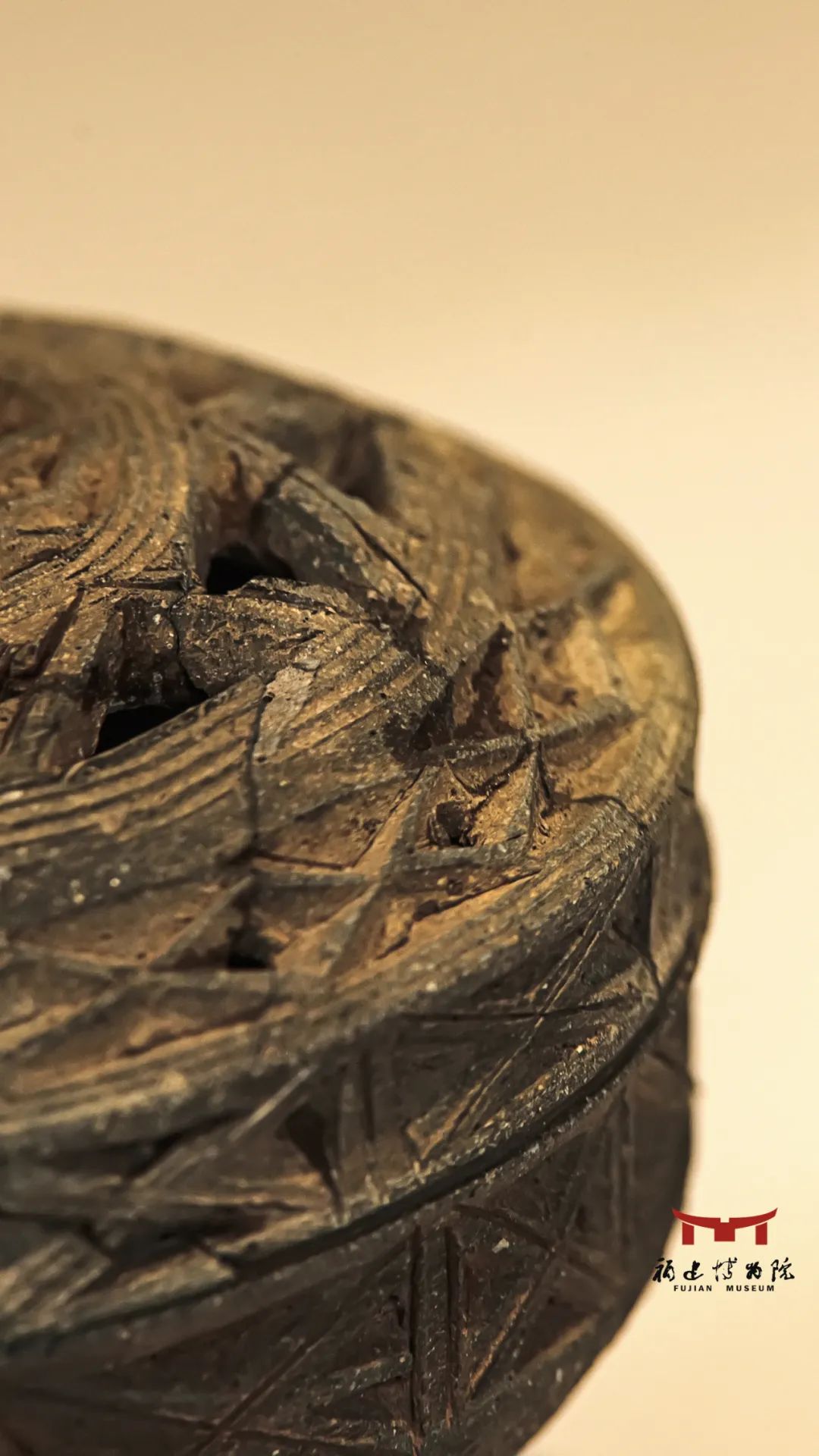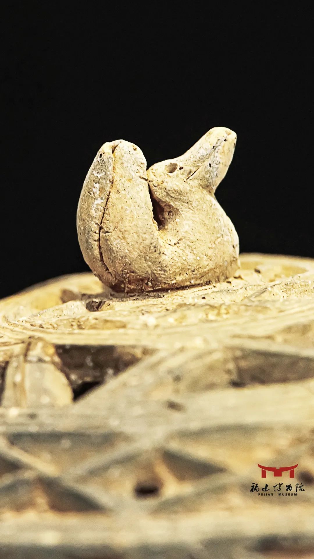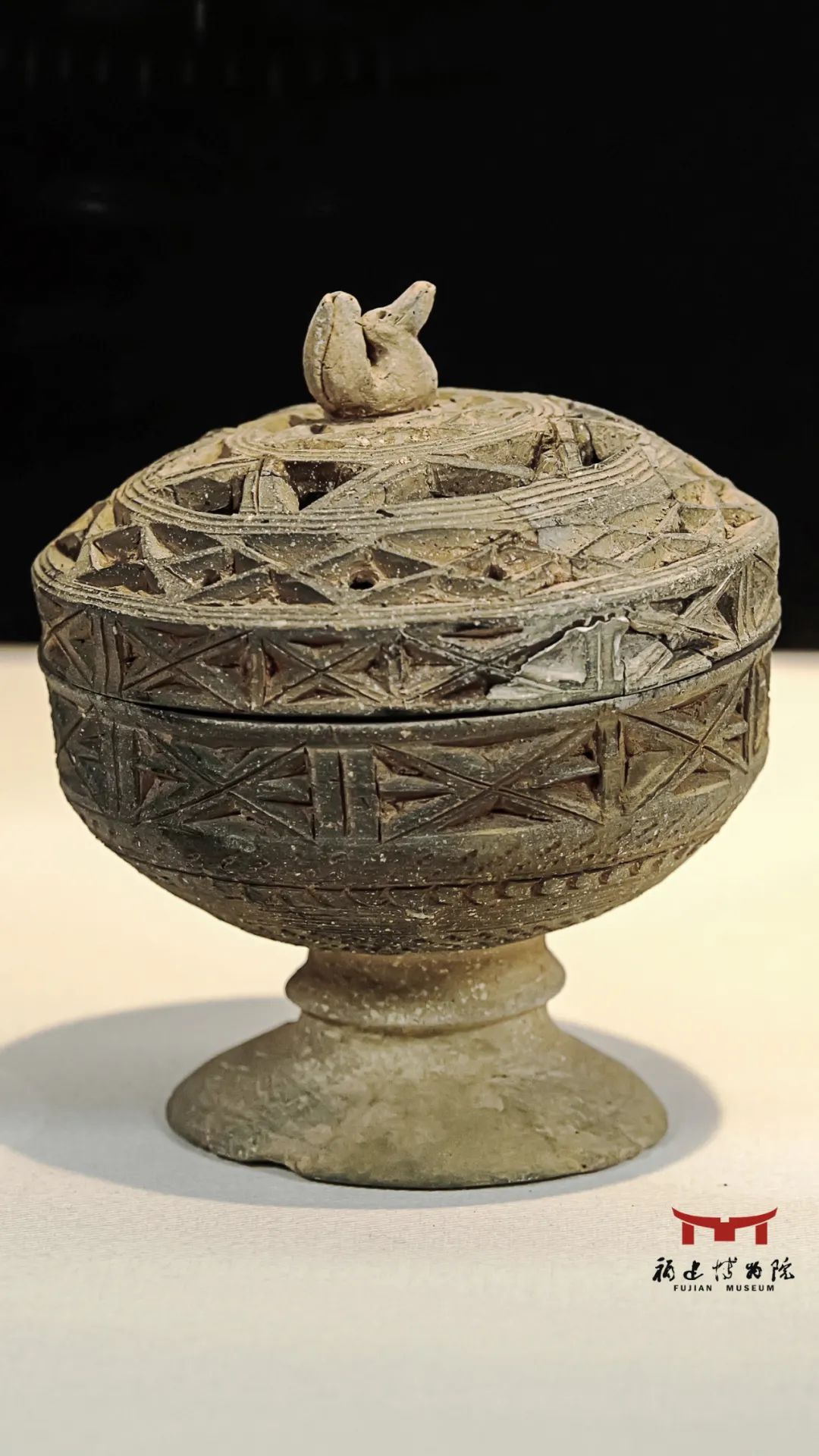 西汉陶香薰,浦城临江金鸡山闽越墓出土。炉整体呈豆形,由炉身和炉盖两部分组成。炉盖遍布圆孔和几何形的出烟口,盖顶还有一个立鸟形钮,现收藏于福建博物院。