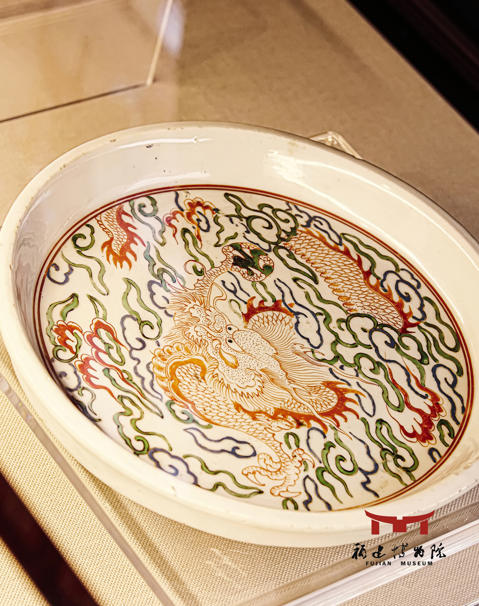 清代德化窑五彩云龙纹盘,盘底内绘有五彩云龙,龙的双目炯炯有神、气势威严,龙爪刚劲。