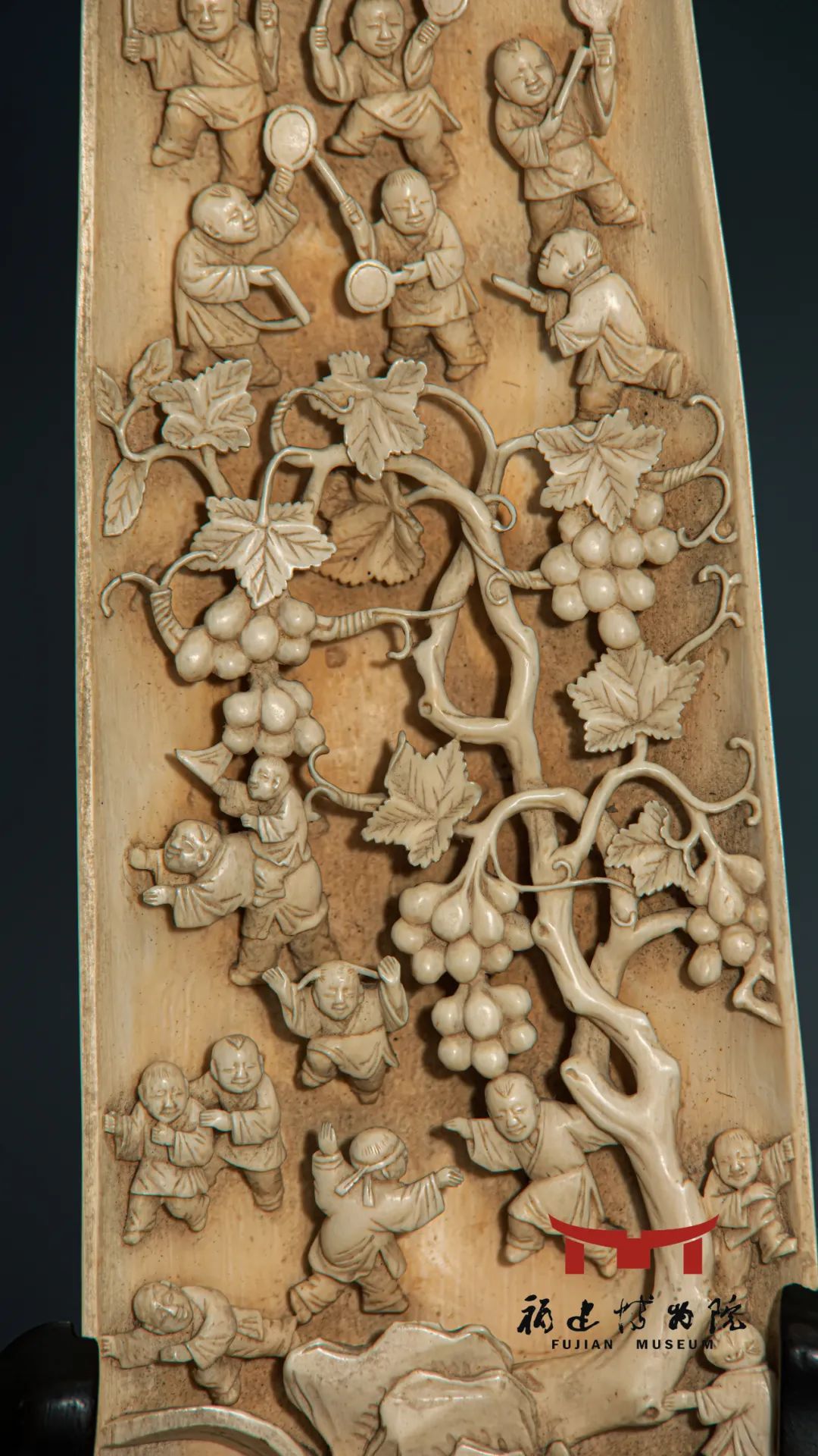 福建博物院藏有一件清代牙雕臂搁。臂搁为象牙质,雕刻了16名神态各异、正在嬉戏玩耍的孩童,他们天真顽皮、活泼好动的天性被生动逼真地刻画出来,令人心生怜爱。中间一棵枝干遒劲有力、叶蔓婉转多姿、果实累累的葡萄树,又巧妙地将众多孩童合理区隔,使得作品繁而不乱,错落有致,体现了超乎一般的匠心和技艺。