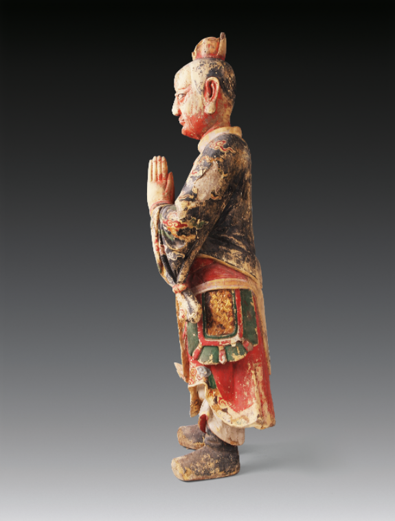 位于泉州的中国闽台缘博物馆收藏有一尊明彩绘木雕金刚立像。通高92.3厘米,头束发冠,额上镶有一个眼睛,内着金色铠甲,腰束玉带,外披绘有五彩祥云纹的开衫,双手合掌举于胸前,双脚穿鞋站立。神像表面用白粉打底后,以红、黄、绿、黑、金等色彩描绘,面部表情威严深邃,衣饰色泽鲜艳亮丽,衣褶线条纹理舒展,柔美流畅。整体形象古朴大方,富有层次和重量感,是明代木雕彩绘佛像中的珍品,为国家一级文物。