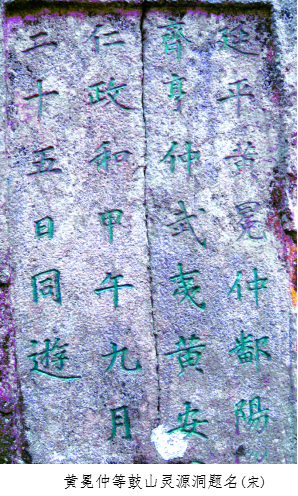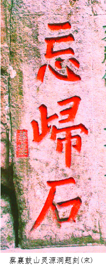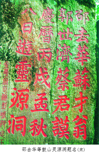 灵源洞是鼓山摩崖石刻最集中处,有宋朝以来的真、行、草、隶、篆书体的题刻100多段。灵源洞前蹴鳌桥下,靠西山壁上藏着一个巨大的“寿”字,署名“晦翁”。后人根据署名认为是宋代理学大家朱熹所书。该石刻为楷书,字高4.15米,宽3.05米,刚劲敦厚,是鼓山单字最大的摩崖石刻,同时也是福建省内少见的大字摩崖石刻之一。“寿”字藏在桥下,“藏寿”谐音“长寿”,寓意美好。相传,朱熹在福州地区写有“福、寿、康、宁”四个大字。“福”在乌山;“寿”在鼓山;“康”在长乐;“宁”在福清。其中“寿”字最大,也最出名。