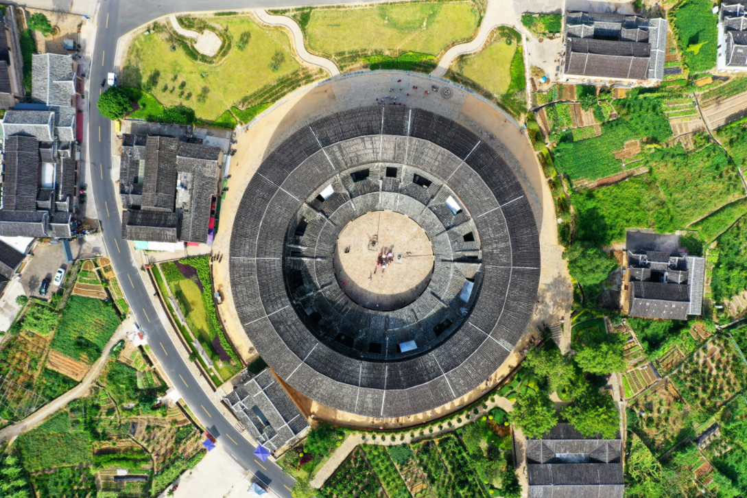 这样一座外观气势磅礴、功能齐全完善、文化底蕴深厚的庞大建筑,所用材料仅仅是黄土、石块和木头,却能与天地山水融为一体,富有生活气息和田园意境。这种简单不简约的意境,让我们惊叹于福建劳动人民化平凡为奇迹的创造力;让我们沉醉于土楼客家人极富文化艺术修养的想象力;让我们向往于“福”文化包容并蓄、掇菁撷华的无穷魅力。