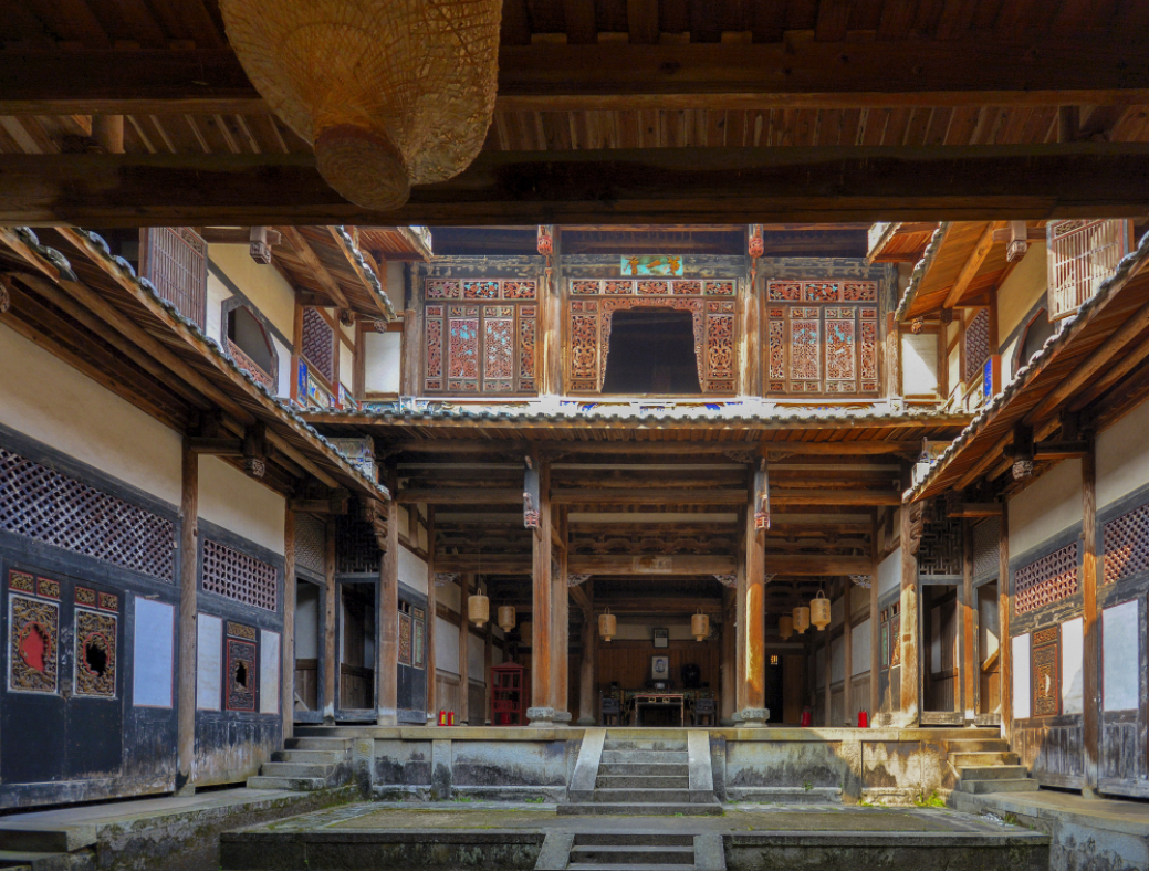 漫步堡内,柱高梁大,富丽堂皇,绝伦精美的木雕、砖雕、壁画、彩绘随处可见,像是走进了艺术世界,让人感受到建筑之匠心,氛围之典雅。许多跟“福”文化有关的细节更是让人惊喜。比如:堡内石阶梯层都是单数,象征阳;后天井较前天井小,象征昌盛的昌字;主楼天井中部的出水处有螃蟹形状的滤水饰件,寓意守住财气等等。