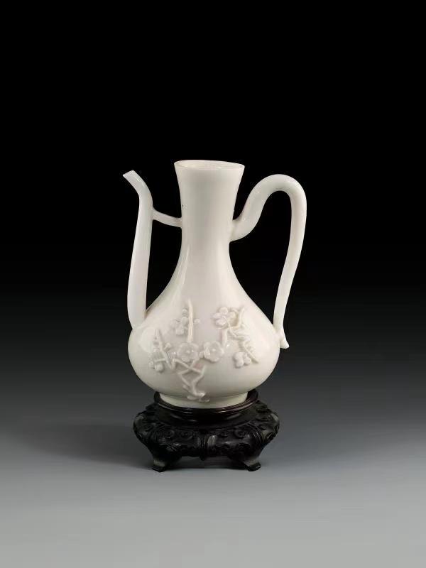 福建民俗博物馆收藏有清代德化窑梅花纹提壶和梅花杯。提壶高15.8厘米,撇口,长颈,溜肩,鼓腹,圈足,腹部两面堆塑梅花纹饰,枝干苍劲有力,花瓣纹理清晰可辨。梅花杯高7厘米,小巧精致,内外施白釉,外壁堆塑梅花纹饰。