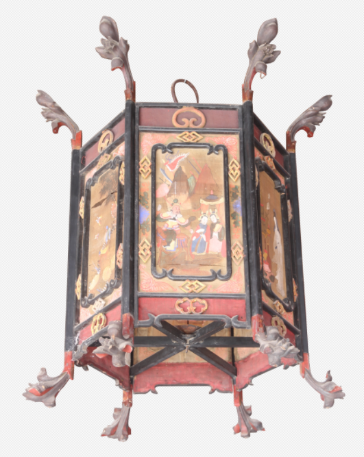 福建民俗博物馆收藏有一件三级文物——清木雕人物博古图宫灯,高80厘米,直径60厘米,云角形,共六面镶框制成,用绢布作底,绘有人物故事、博古图案、卡子花纹等,优美别致,装饰华丽。