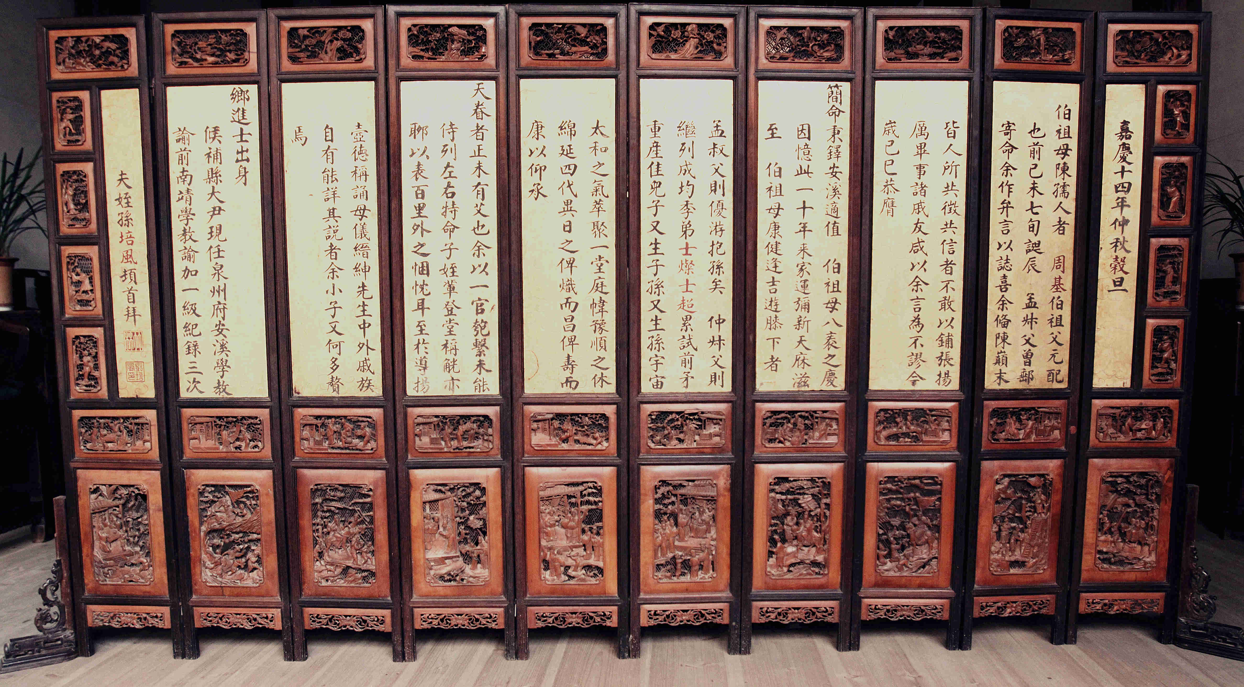 祝寿围屏出现于明末清初,是寿庆礼俗的重要礼器,既作室内空间间隔、装饰之用,又满足庆寿的礼仪之需,蕴含着深厚的祝寿文化。这件围屏是清嘉庆十四年(1809年),泉州安溪学教谕邓培风送给伯祖母八十大寿的贺礼,阴刻于金漆为底的屏心上方的祝寿序文描述了伯祖母一家家族昌盛、子孙绕膝的情景,同时表达了对伯祖母的美好祝愿。
