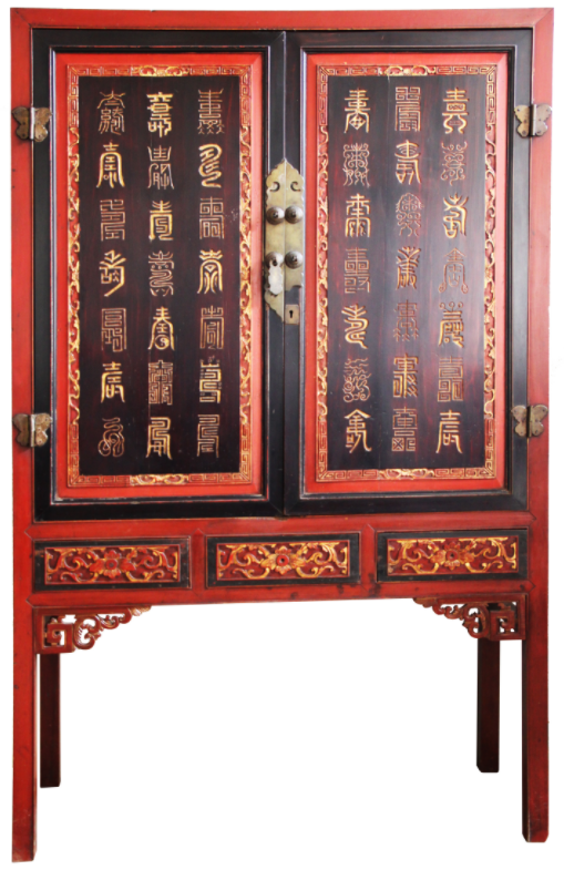 柜的主要用途是储藏物品,这一储藏类家具早在汉代时期就已出现,后不断改良升级。福建常见的柜、橱类家具多髹以红、黑色漆为底,其上以金或其他颜色彩绘图案,多为人物故事、花草博古等,这些传统纹饰通常有着丰富的文化内涵。这件百寿立柜就是当时流行的高脚柜,在室内陈设中不仅实用且寓意美好。