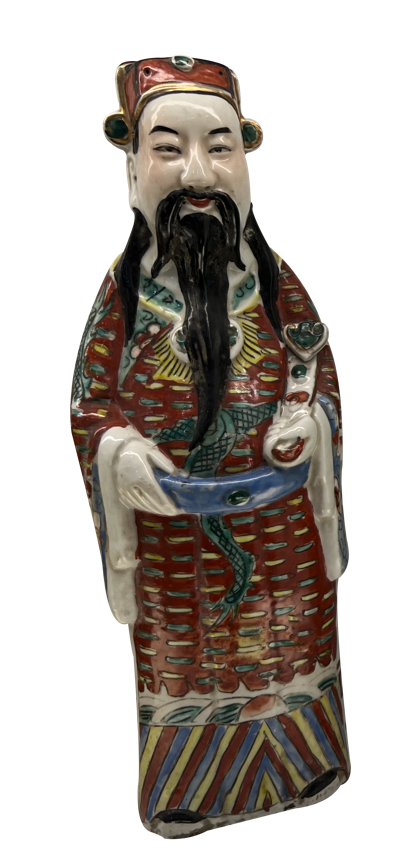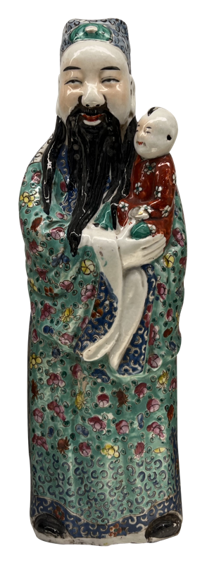 福建民俗博物馆藏有一组民国时期粉彩瓷“福禄寿三星”人物立像,高42厘米。福星神态安详,面色红润,身着粉彩锦袍,抱持金笑面童子,寓意福气绵绵;禄星神态威严端庄,身着粉彩官袍,腰扎官带,衣袂飘飘,手持如意;寿星前额突出,身着粉彩锦袍,纹饰繁复精丽,双手持杖,寓意长寿。