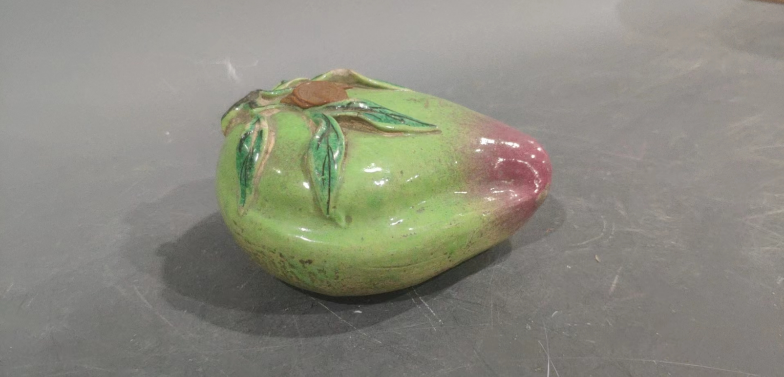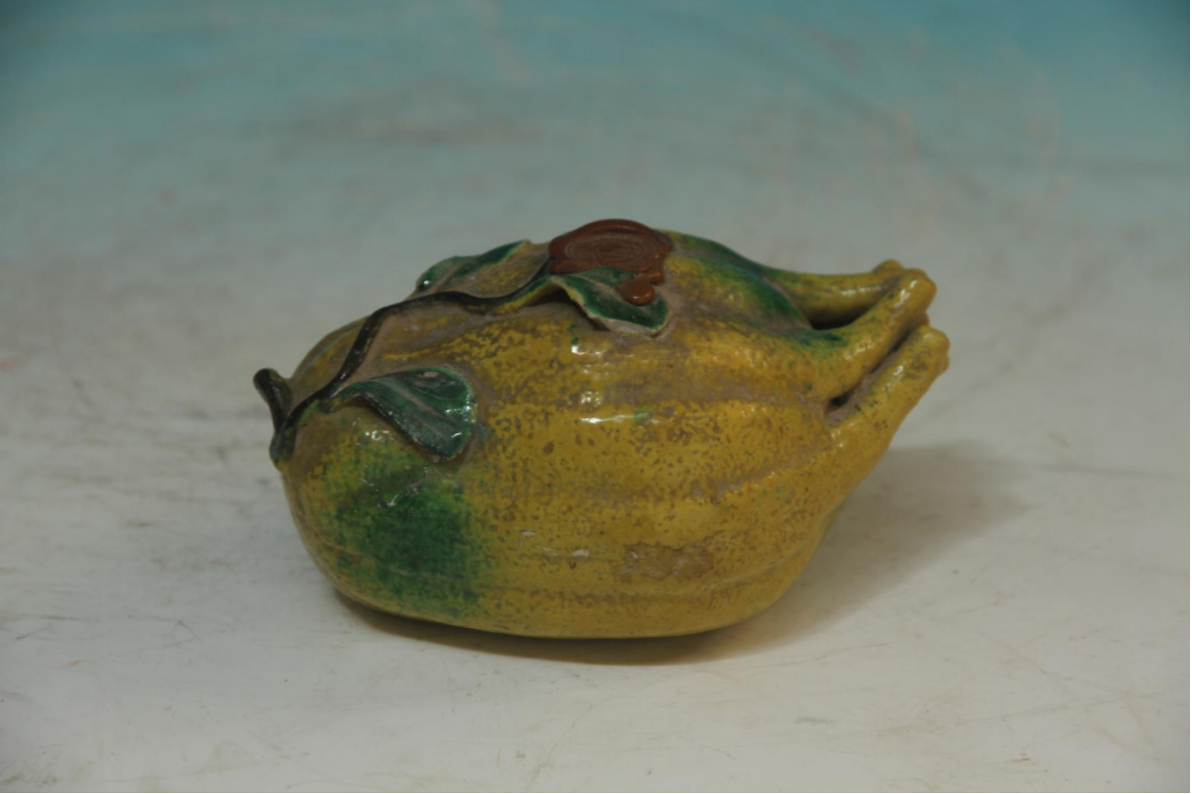福建民俗博物馆收藏有一组民国时期的粉彩仿生瓷果,造型有橘子、佛手瓜、石榴、荔枝、花生、桃子、桂圆等。佛手瓜瓷果,长12.5厘米,宽10.5厘米,高6.5厘米,黄中带点青绿色,枝叶曲卷缠绕在上端,惟妙惟肖。