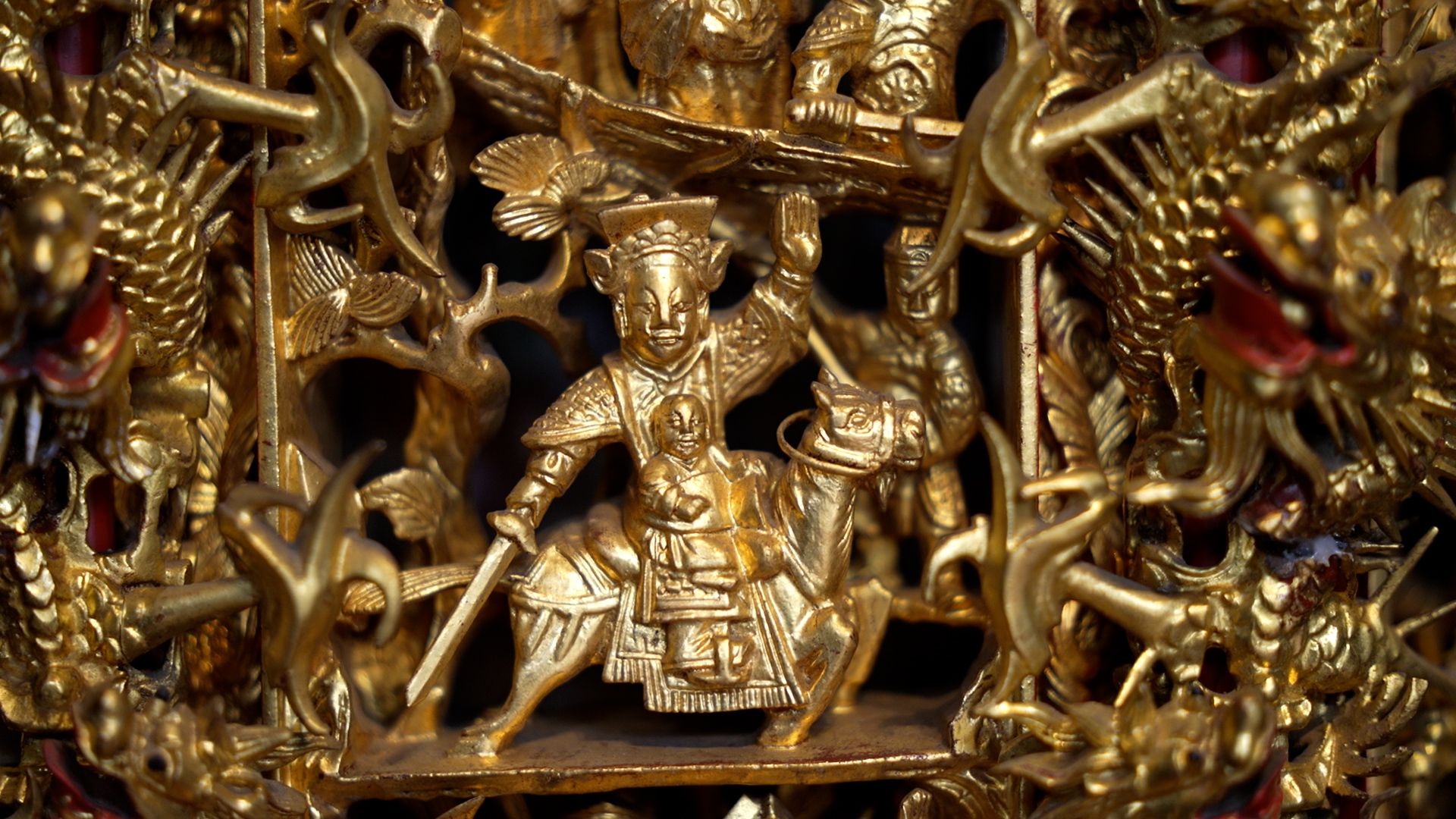 受地域和信俗文化的相互影响,沿海邻省如广东潮汕的金漆木雕、浙江宁波的朱金漆木雕等也常见此类礼器,髹漆、贴金等制作工艺不尽相同,但都用于祭祈活动中盛放供果。纹饰多为传统历史典故、八仙人物、花卉瑞兽等,寄寓了讴歌先贤、向往美好生活的文化理念。