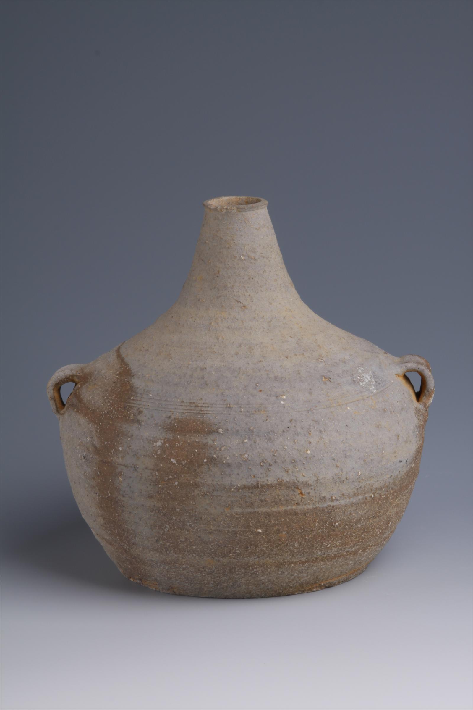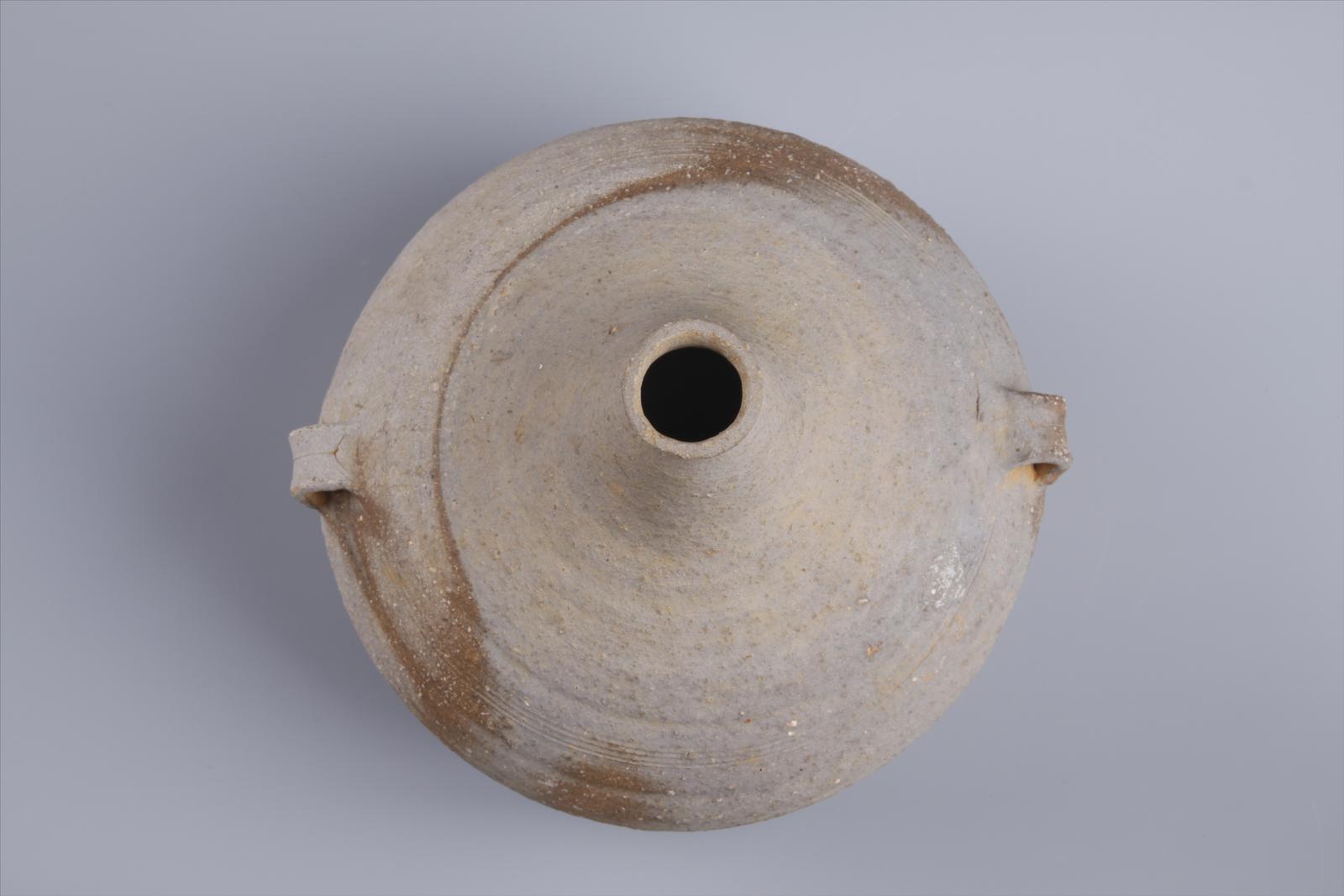 汉弦纹双系陶匏壶于1986年将口镇邵口布遗址出土,现藏于南平市建阳区博物馆,系国家二级文物。匏壶泥质灰陶,小口,细颈,溜肩,球形腹,下腹部内收,平底微内凹,造型似葫芦,俗称“葫芦瓶”。肩部堆贴一对扁耳,腹部饰两排细弦纹。胎色深灰,质地坚硬。口径:3.17cm,腹径:17.12cm,底径:12.43cm,高:18.19cm。