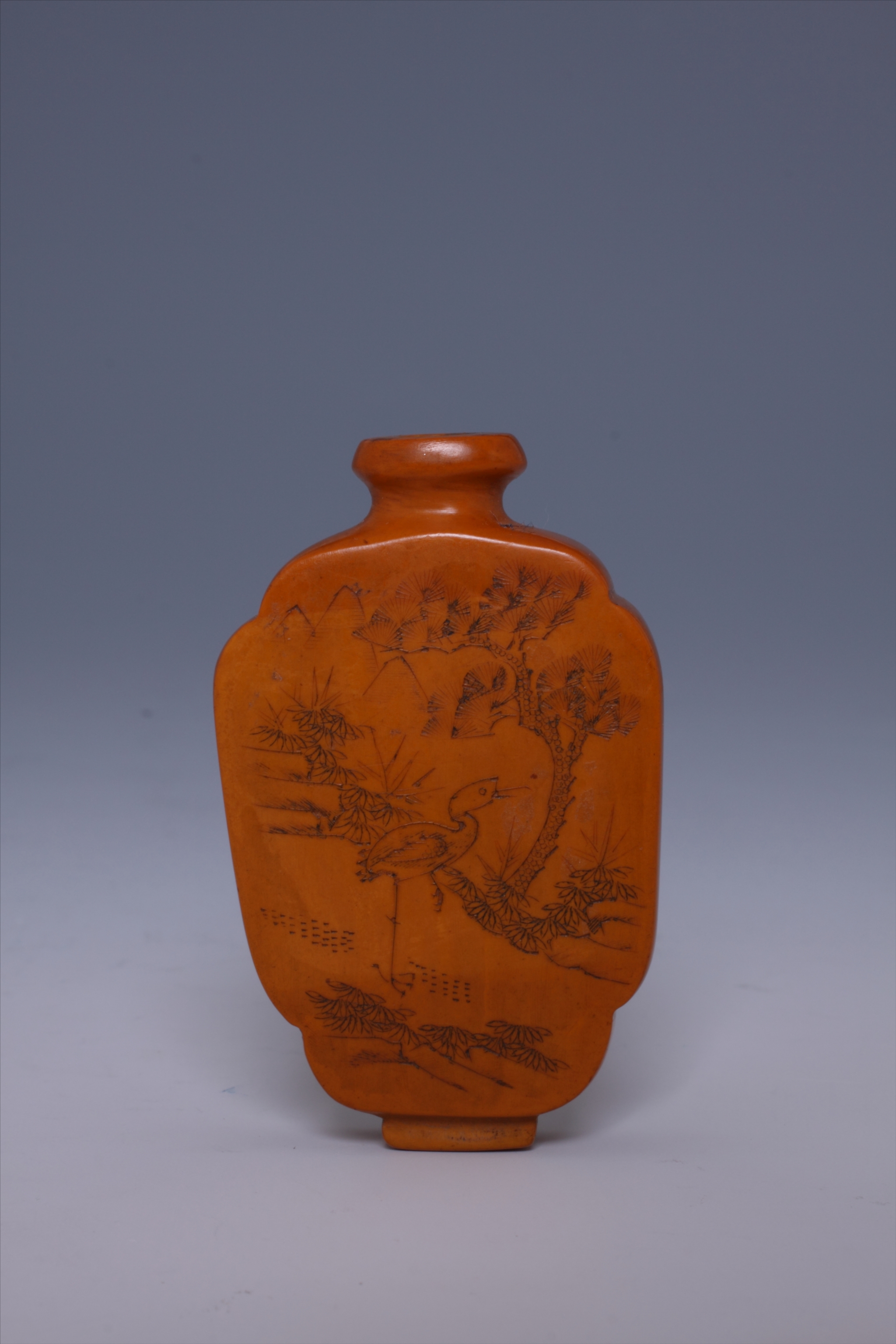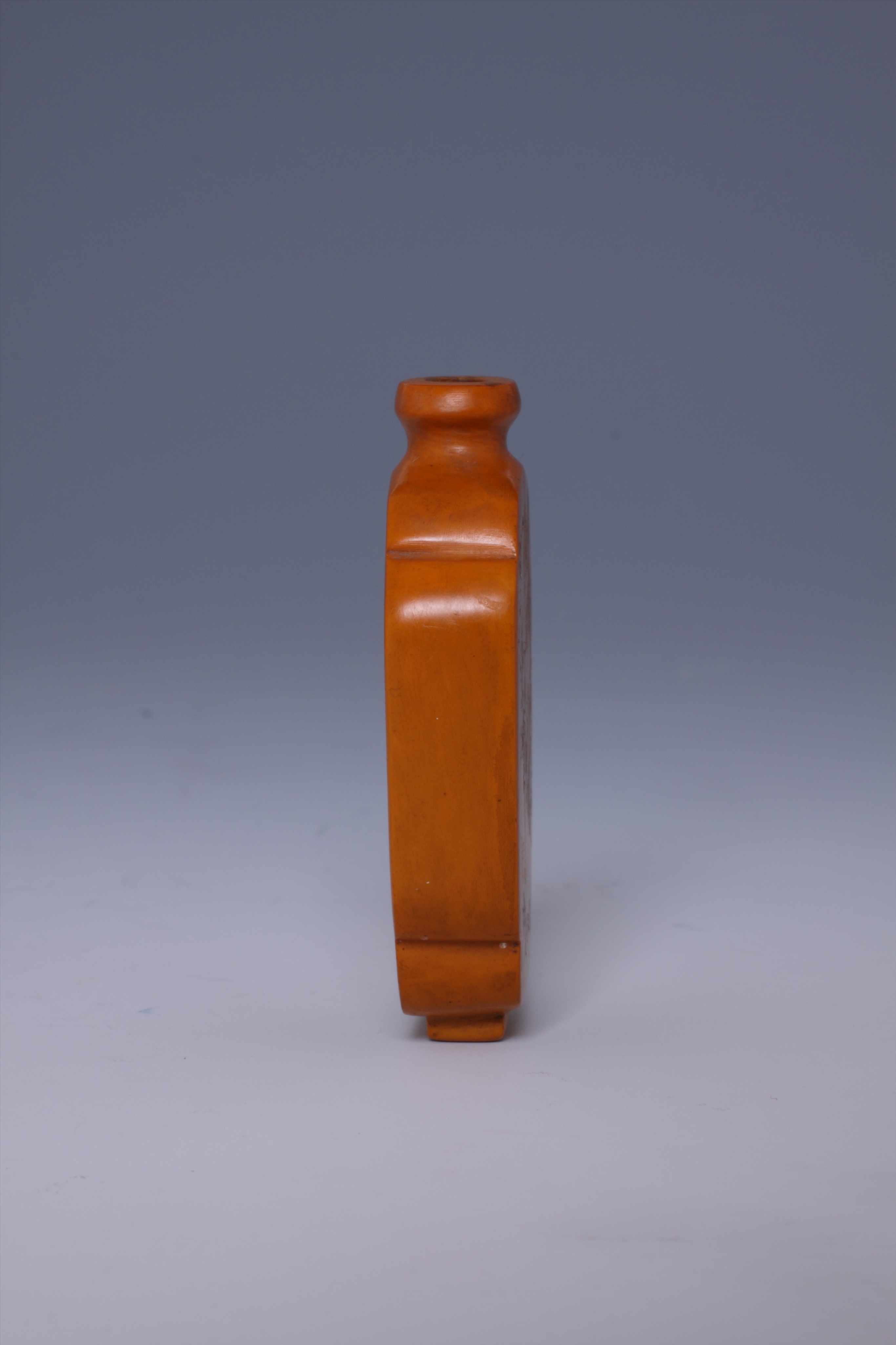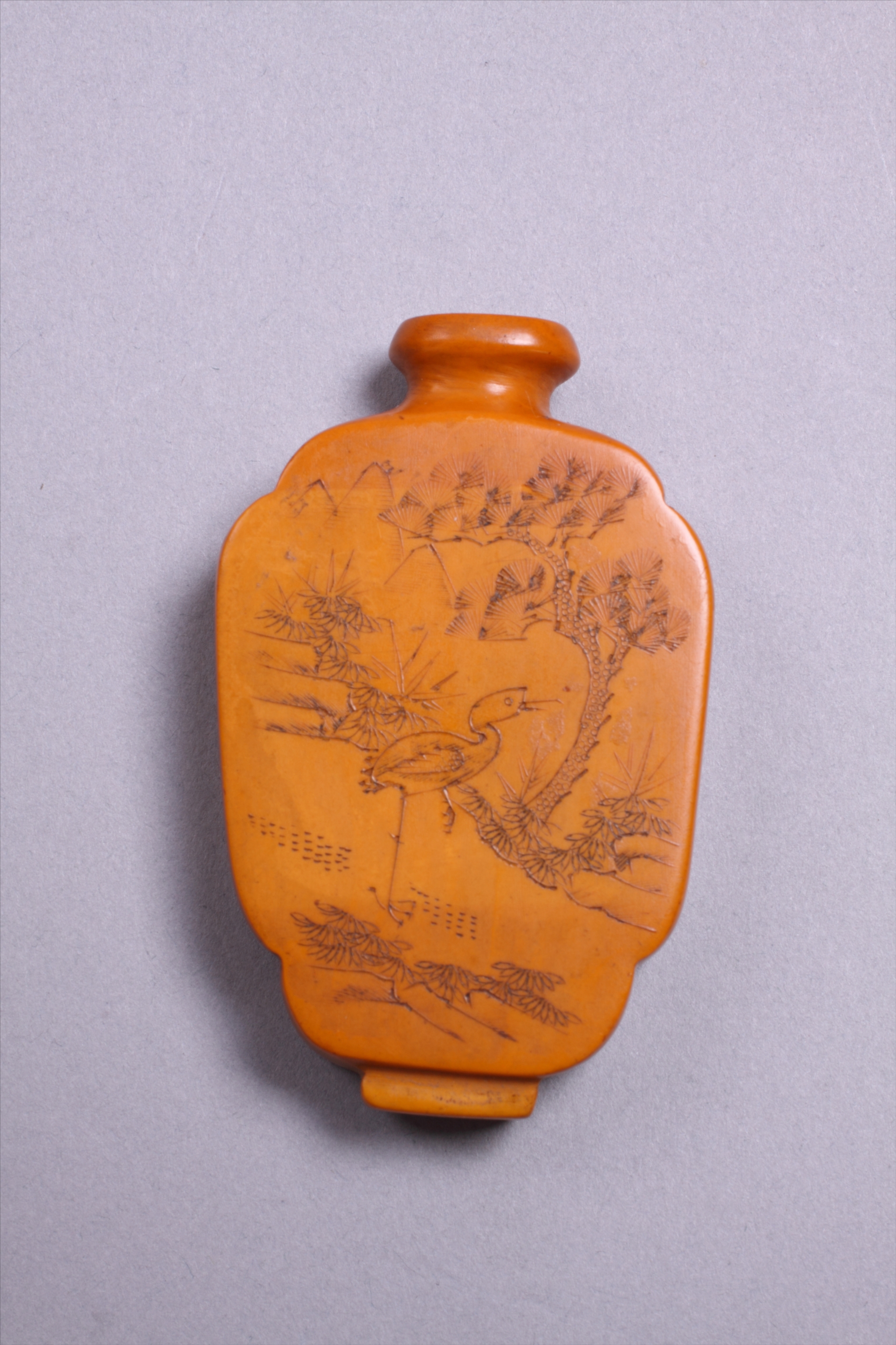 清象牙雕人物纹鼻烟壶,莆田市博物馆藏,三级文物,口径最长1.2cm,最宽1cm,底径长1.2cm,宽0.7cm。小圆口,束颈,扁平腹,如意形,方形底,象牙雕,呈棕黄色,附木底座。椭圆形口沿,腹壁两面分别雕刻“松鹤”、“人物”图纹。雕工精细,造型精美。