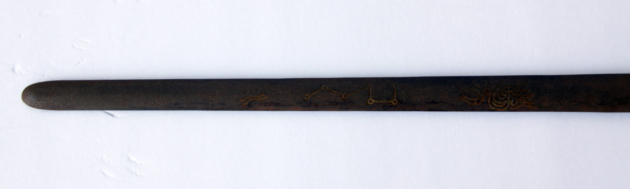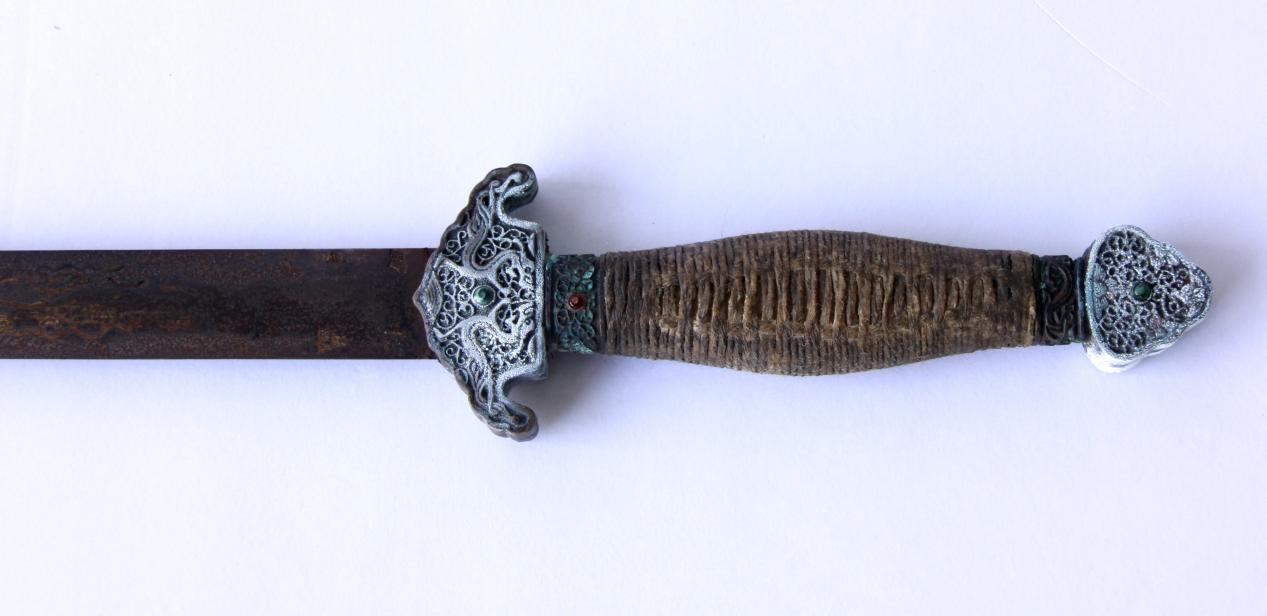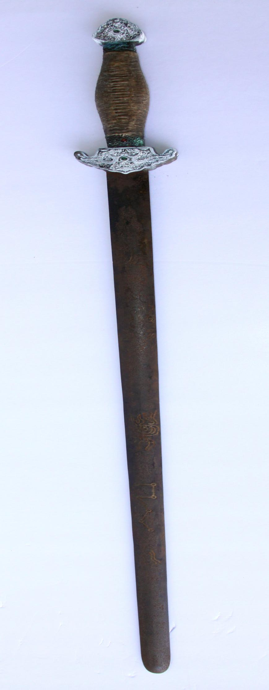 钢质,剑身长78厘米,上刻北斗七星和祥云图案,剑柄长24厘米,镶嵌有红绿宝石。