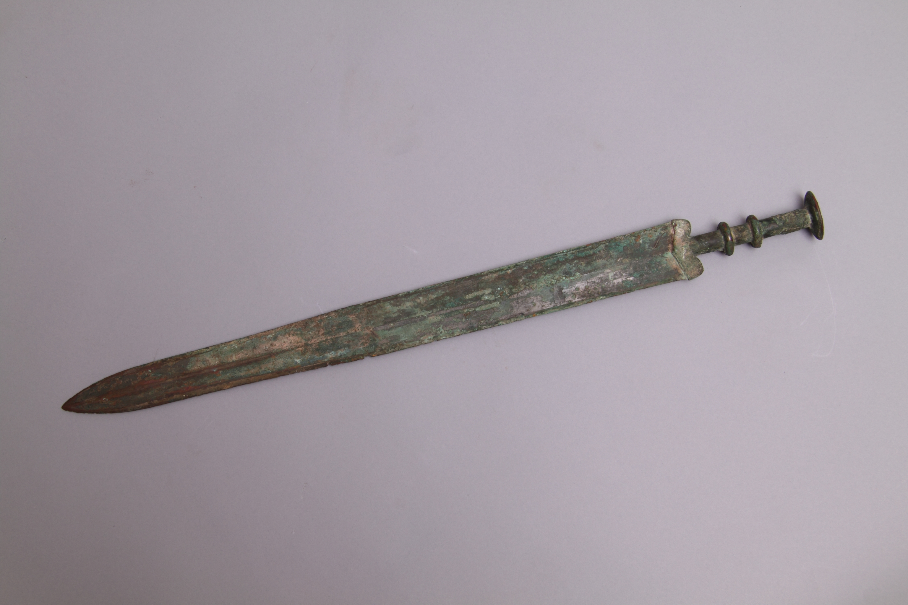 青铜铸造,素格素首,柳叶形剑身,刃非常锋利,脊凸起,柄中间有双箍,剑首呈漏斗形,器身较沉。