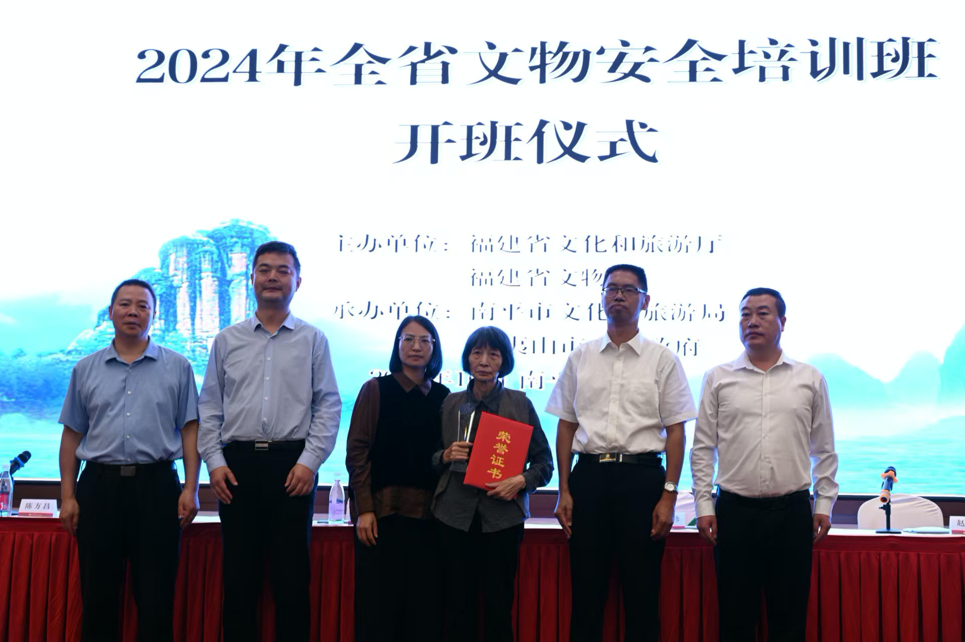 开班式现场还专门为我省入围全国第六届“最美文物安全守护人”推荐名单的建瓯市中共闽北临时委员会旧址纪念馆文物安全管理人沙无泞举行了颁奖仪式。国家文物局督察司安全一处处长刘伯良、省文物局副局长林文珍为沙无泞颁发了奖状、奖杯。