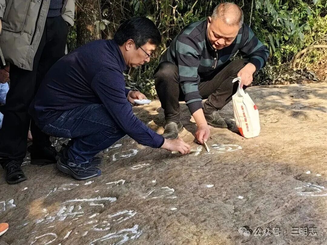 普查队队员认真研究明溪县瀚仙镇魁头山史前岩刻遗址符文。