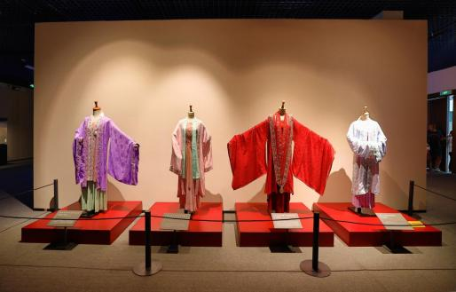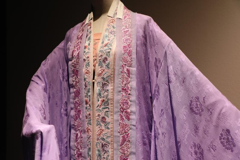 走进本次特展的第一展区,在“那时花开”的主题映衬下,罗、绫、绮、绢、纱、绉纱、缎等各种高级织物共同诠释了一幅“裁绢罗,纺羽织烟,顾盼遗光彩”的华美光景,每一件都可以说是当时的时尚单品,很多款式放至如今也相当流行。