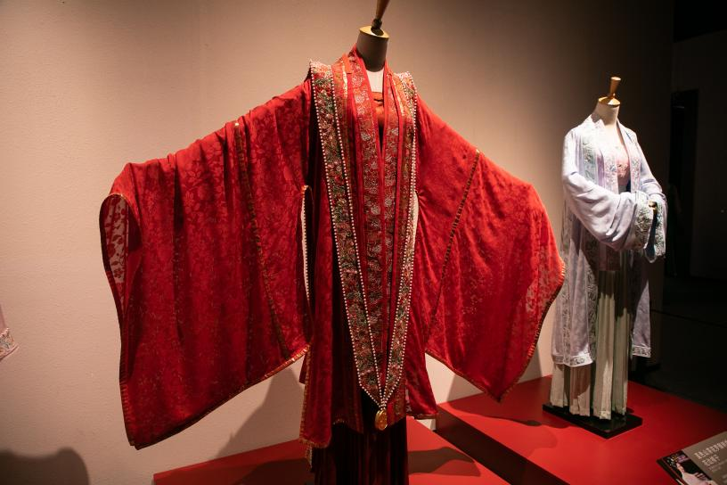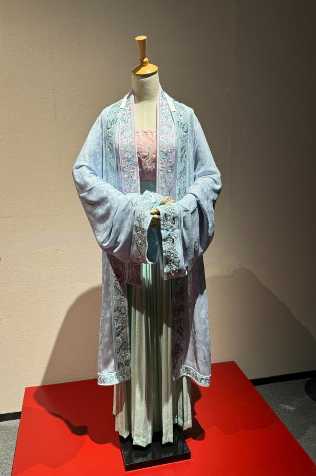 参照黄昇墓出土服饰实物和宋画中的人物形象,《国家宝藏》造型总设计师张婷也为节目复原设计了十多套华美服饰,其中以四套最为经典,它们分别是黄昇(陈都灵饰)、李可儿(萨娜·哈兹里饰)等角色登台的剧服,这四套服装于在本次福建博物院特展中首次展出——刺绣花边大袖衫上,海棠与梅花争艳,灵动如流泉;牡丹刺绣花边长褙子屡屡轻飘,月桂纹间溢清香;印金刺绣大袖袍,霞帔炫彩,金坠雕有双凤朝莲花;山茶花刺绣花边褙子淡雅适体,低调中尽显绝代芳华。