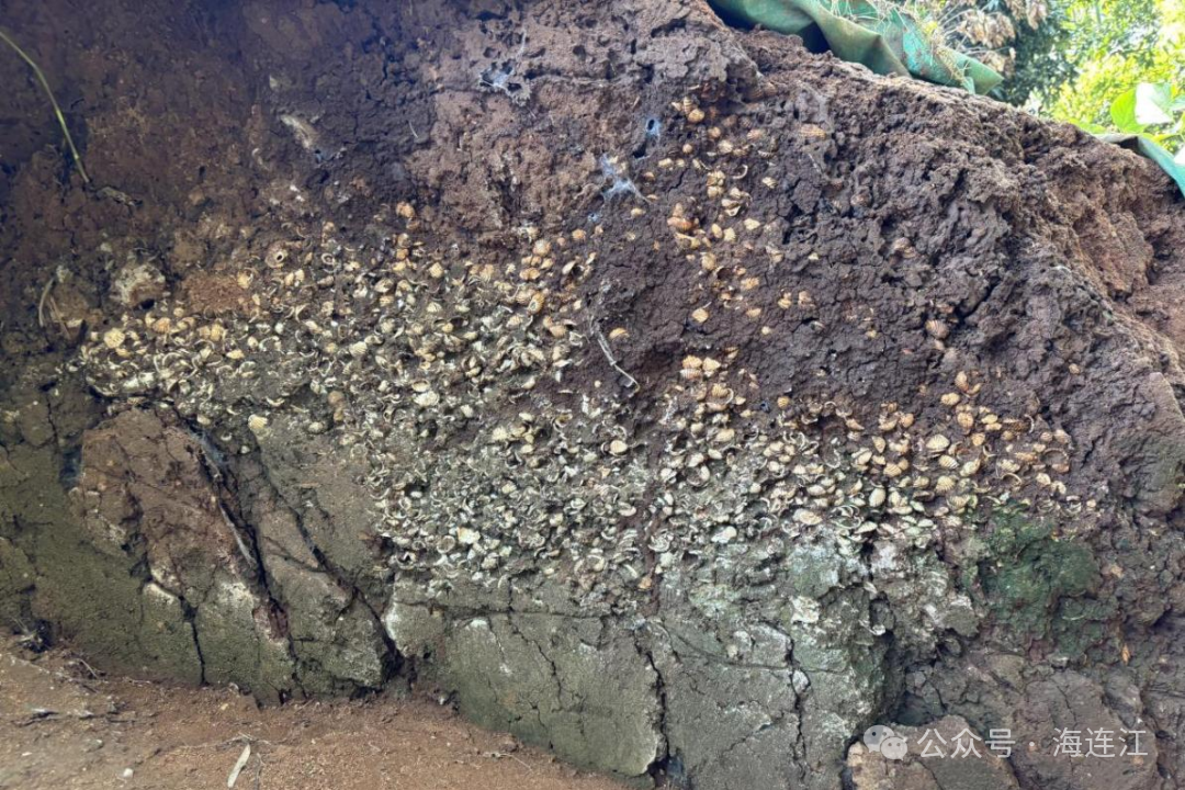 ▲炉溪山遗址断面蛤蜊壳堆积