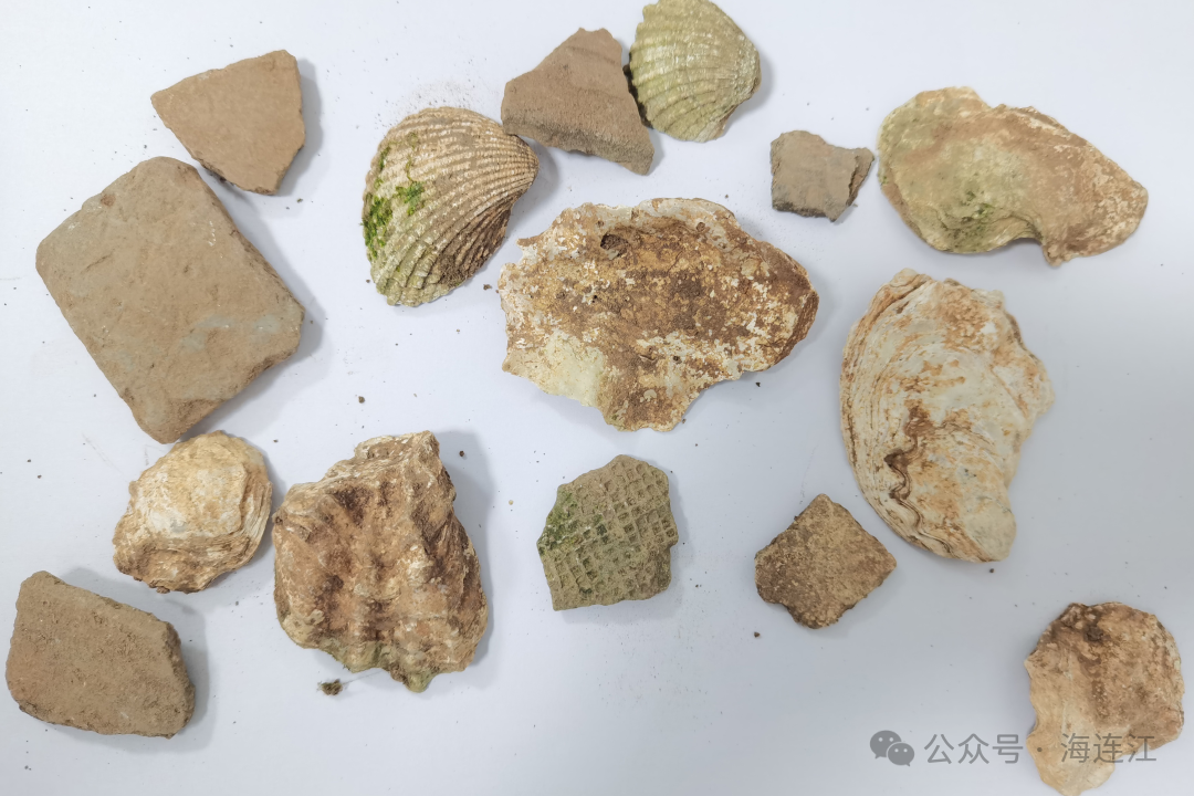 ▲炉溪山遗址采集的贝壳和陶片
