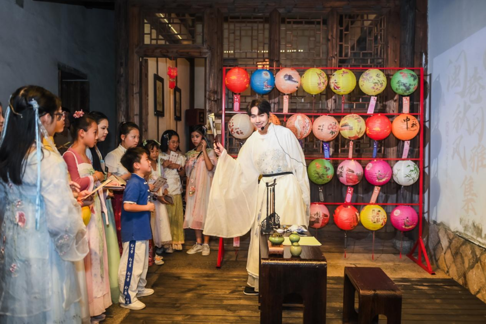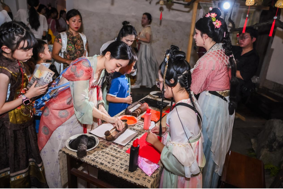 活动中,多个互动环节生动展现闽地中秋的雅趣与民俗。“月下飞花”区内,“门房张大爷”与游客围坐品茶,共诵诗词、讲述民间故事,重现古人“赏月咏怀”的风雅;“投壶赢方”区域则充满欢声笑语,游客在“厨娘”和“小少爷”的引导下体验传统投壶游戏,了解其从礼仪演变为民间娱乐的历史;“灯谜解谜”区前,“教书先生”引导游客破解融入闽地文化的灯谜,在趣味中加深对地方文化的认知;“拓印手作”则让游客亲手制作中秋纪念品,感受传统技艺的温度。