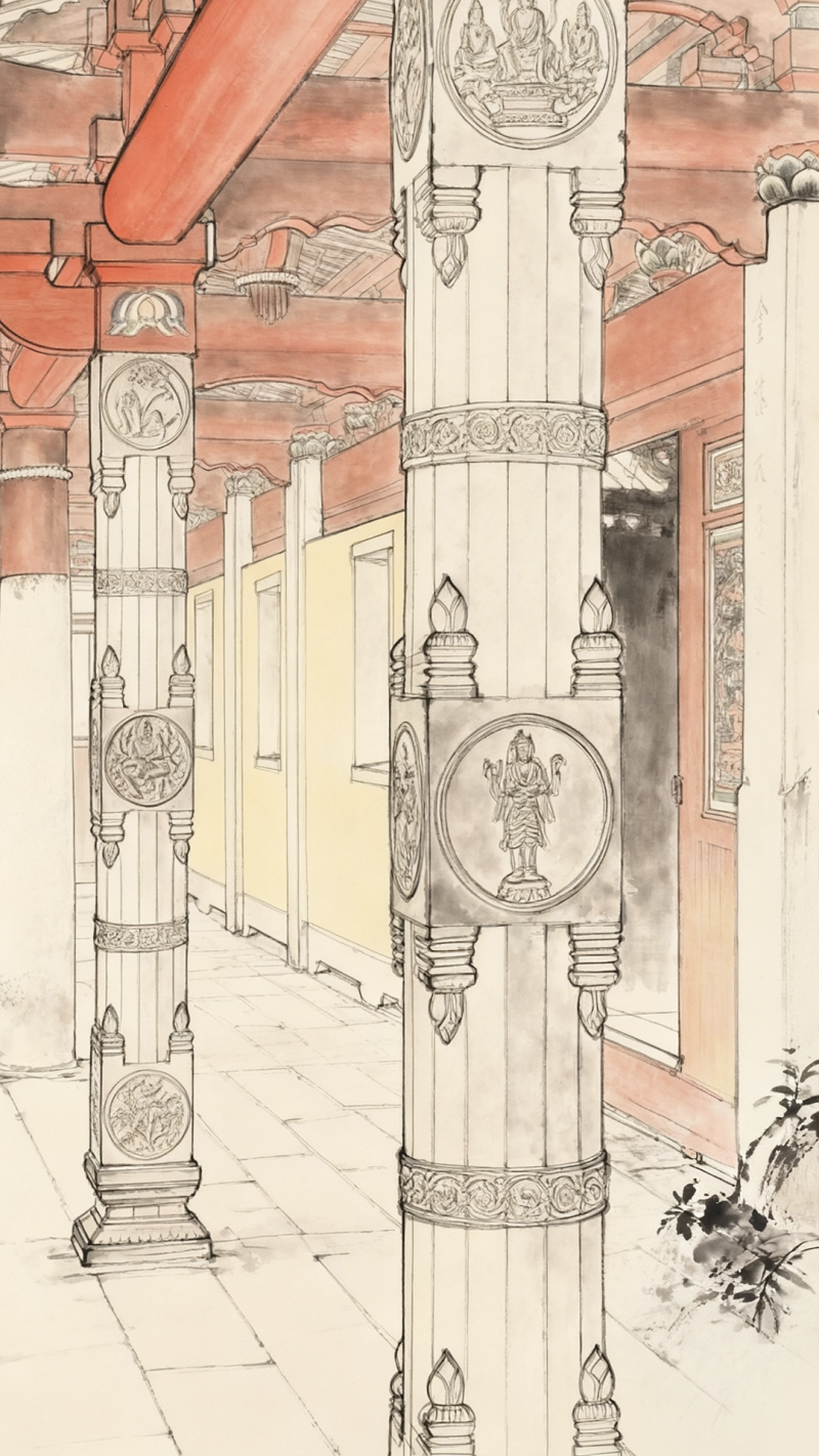 泉州开元寺具有锡兰风格的16角石柱(AI制图)