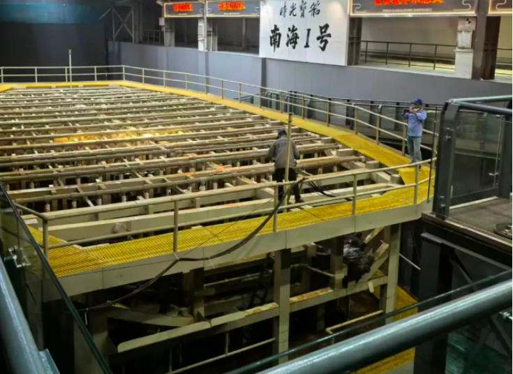 近日,广东海上丝绸之路博物馆“水晶宫”首次开放,公众可以走入其内部近距离观察“南海Ⅰ号”船体。古船由大型的钢架作基本支撑,外部被支架式的喷淋系统包裹。“南海Ⅰ号”从被发现到打捞上岸,经历了近20年人员培养、技术经验积累和方案论证,到2007年底,运用沉箱进行整体打捞后,安置在广东海丝馆“水晶宫”内。过去十余年间,公众只能隔着玻璃观看古船。2023年,“南海Ⅰ号”古沉船船体发掘工作正式结束。目前,船体的脱盐、脱锈以及船体填充加固及脱水定型等修复保护措施仍在持续展开。