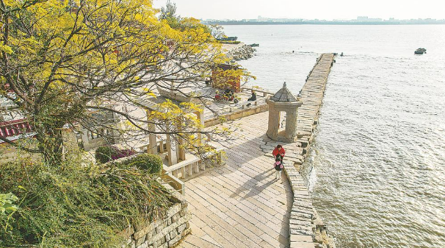 大家看这个礁石上的台阶,可以帮助我们推测当时码头运的是什么货物。距离较远的两排台阶用来挑瓷器等重物,两个工人抬着货物,一人踩着一排台阶,把货物送到岸上或船上。”近日,在林銮渡,泉州石狮市市情讲解员曾棋祥说得形象有趣,游客们听得津津有味。