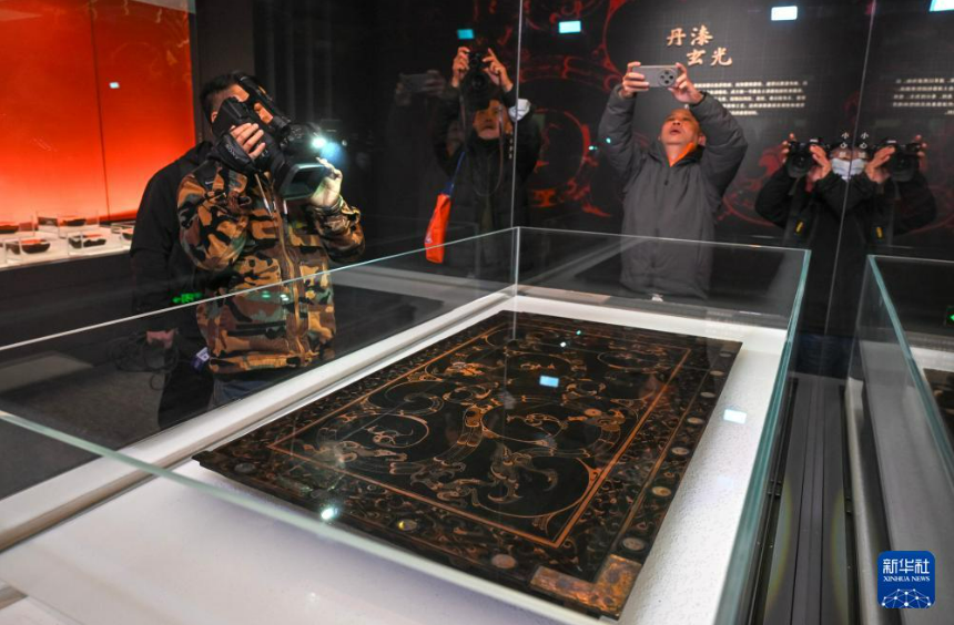 这是展出的彩绘龙凤纹漆木案(12月26日摄)新华社记者 金良快 摄