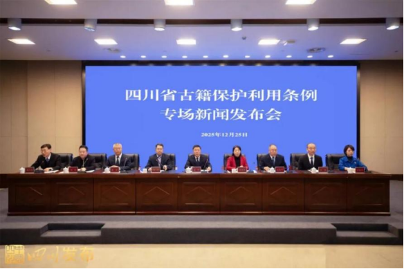 12月25日,《四川省古籍保护利用条例》专场新闻发布会在四川省图书馆(四川省古籍保护中心)举办。会上深入解读条例的立法背景与核心亮点,条例共34条,主要包含了厘清古籍相关定义及部门职责、提高古籍保护水平、发挥科技在古籍保护利用中的作用、促进古籍有效利用等多方面内容。会上宣布,这部国内首部古籍保护利用工作的地方性法规将于2026年1月1日起正式施行。