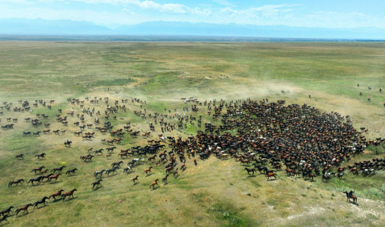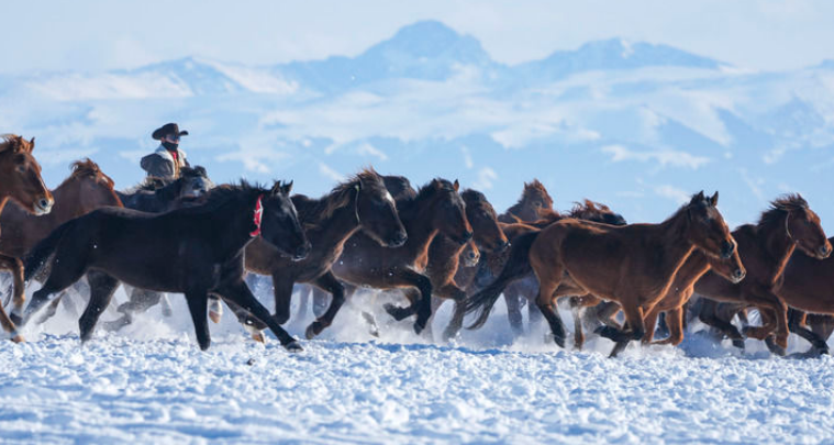 从神秘悠远的阿尔泰山、巍峨雄壮的天山,到莽莽昆仑山,总能见到宝马名驹奔腾的恢弘景象。万千骏马奔驰在地域广袤的新疆,也奔跑在各族居民共有的精神家园。