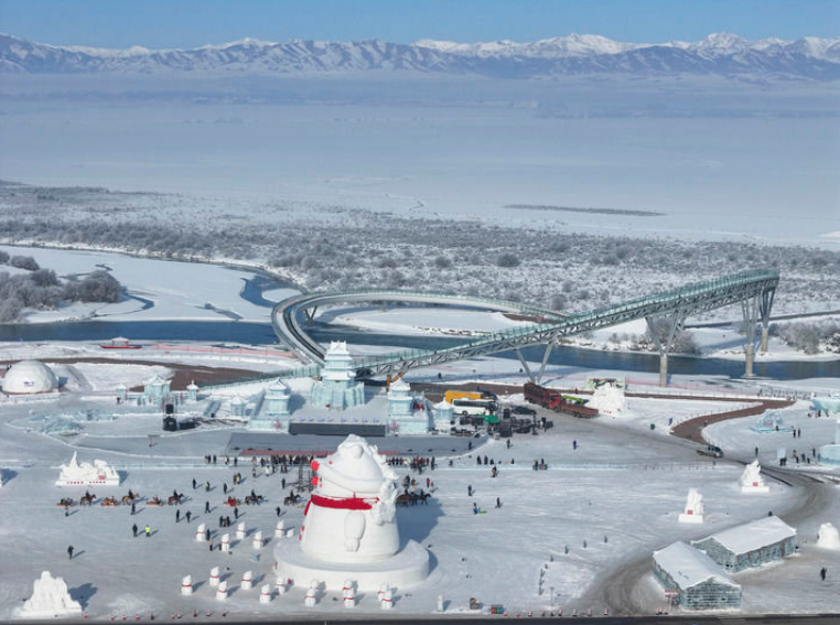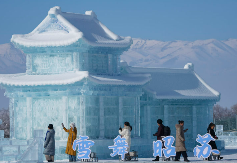 2026年1月3日,游客在新疆昭苏县冰雪乐园参观冰雕作品。新华社记者 胡虎虎 摄