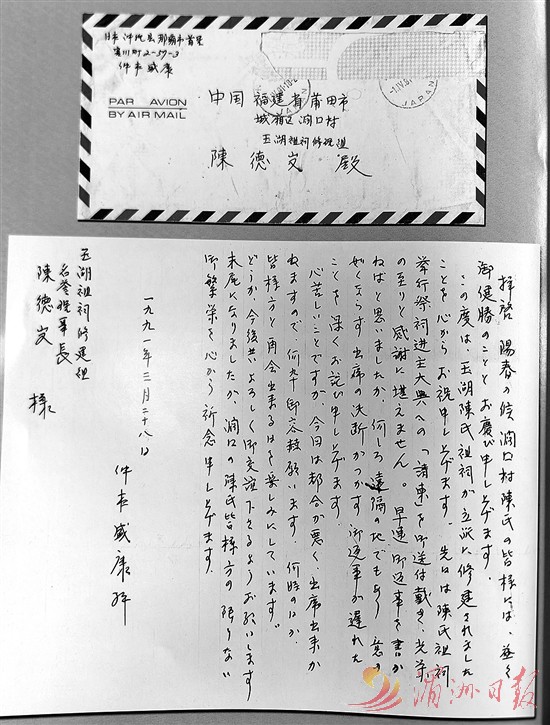今年12月3日,在莆田市阔口玉湖陈氏祖祠,莆田学院原研究员陈天宇出示了一封1991年3月28日寄自琉球的信。信中日语与汉语夹杂,有些晦涩难懂。经日本千叶大学博士后、莆田学院工艺美术学院李丹副教授翻译,得知这是一位署名“仲本盛康”的陈姓宗亲寄给玉湖陈氏祖祠名誉理事长陈德发的信。信中祝贺玉湖陈氏祖祠落成,感谢邀请参加祭祀大典,并表示因身体不适未能成行,期待日后相聚。