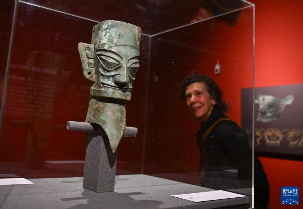 展厅内,来自三星堆遗址的代表性文物——青铜人头像立于序厅中央,吸引中西嘉宾和观众驻足观赏。参观者由此依次步入展览的3个单元,近距离欣赏铜人形器、执伞男铜俑、饰虎铜釜等精美青铜文物,了解中国西南地区不同区域文明交流互动、融合发展的历史进程。