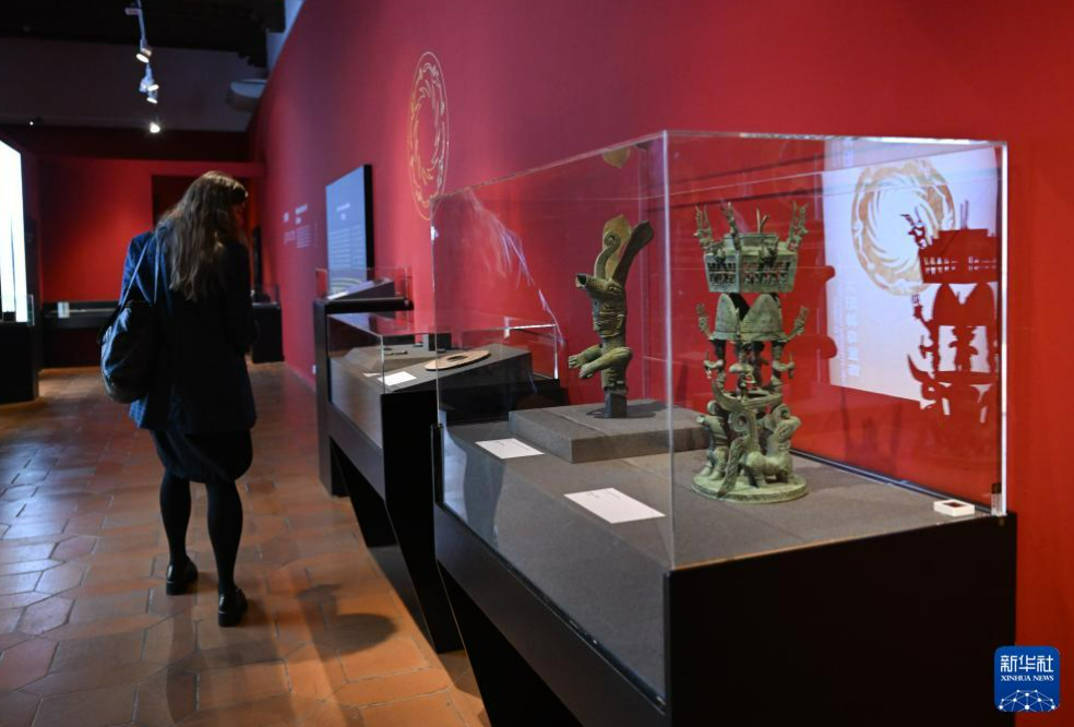 3月17日,在西班牙瓜达拉哈拉博物馆,一名女子参观中国西南地区青铜文明展。新华社记者 程敏 摄