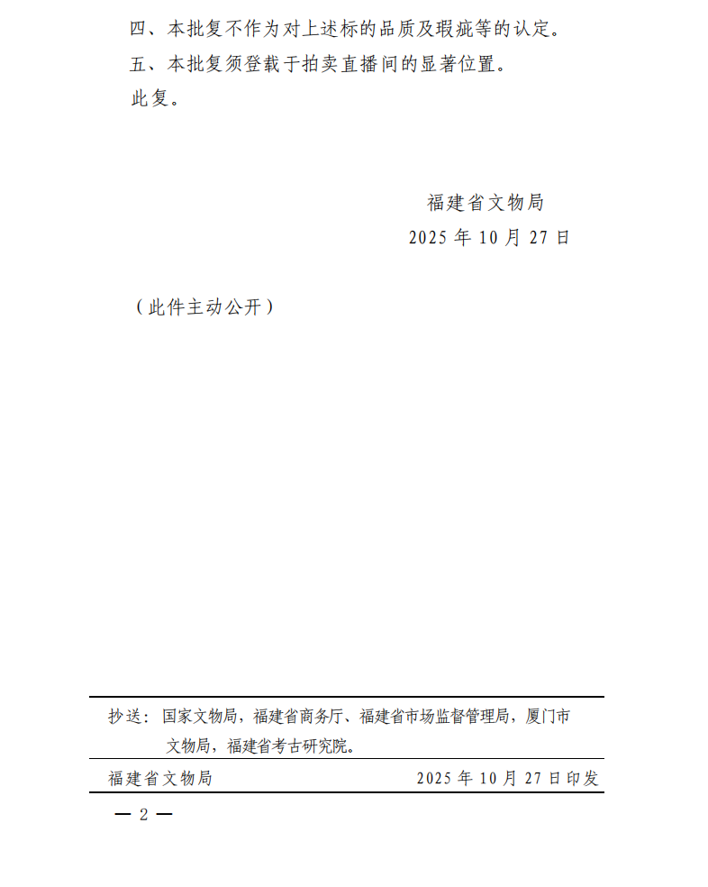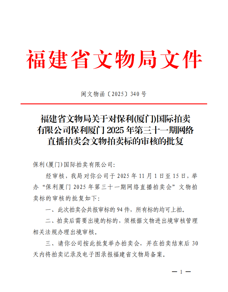 福建省文物局关于对保利(厦门)国际拍卖有限公司保利厦门2025年第三十一期网络直播拍卖会文物拍卖标的审核的批复