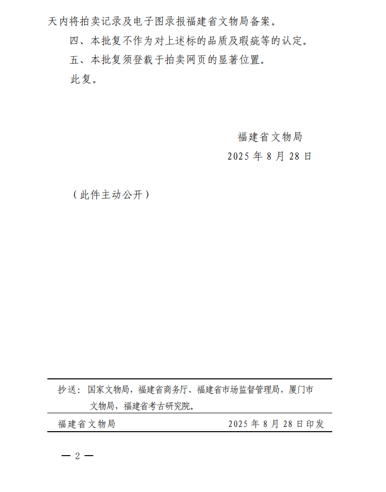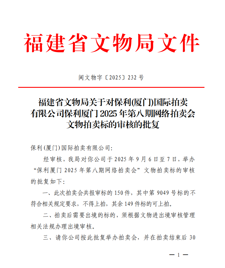 福建省文物局关于对保利(厦门)国际拍卖有限公司保利厦门2025年第八期网络拍卖会文物拍卖标的审核的批复