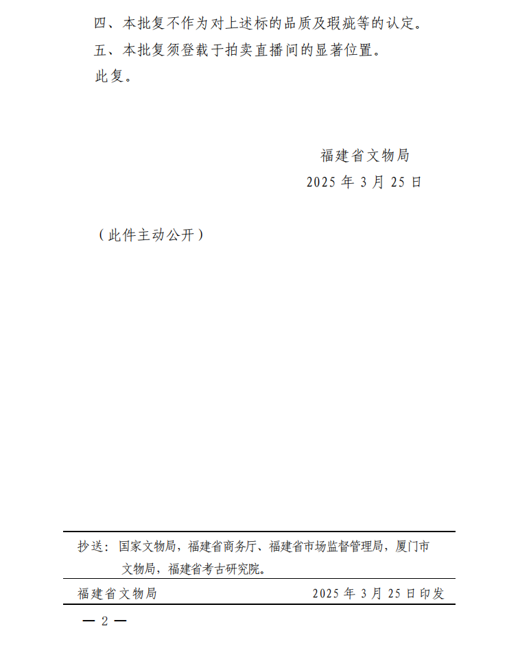福建省文物局关于对保利(厦门)国际拍卖有限公司保利厦门2025年第八期网络直播拍卖会文物拍卖标的审核的批复