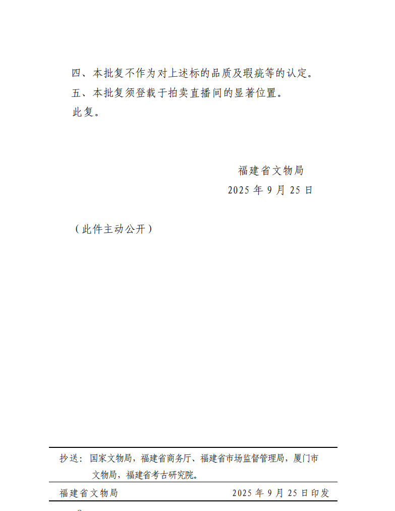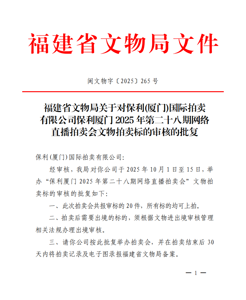 福建省文物局关于对保利(厦门)国际拍卖有限公司保利厦门2025年第二十八期网络直播拍卖会文物拍卖标的审核的批复