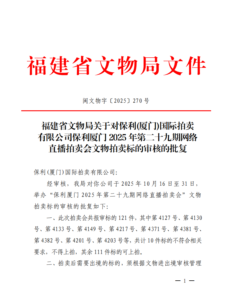 福建省文物局关于对保利(厦门)国际拍卖有限公司保利厦门2025年第二十九期网络直播拍卖会文物拍卖标的审核的批复