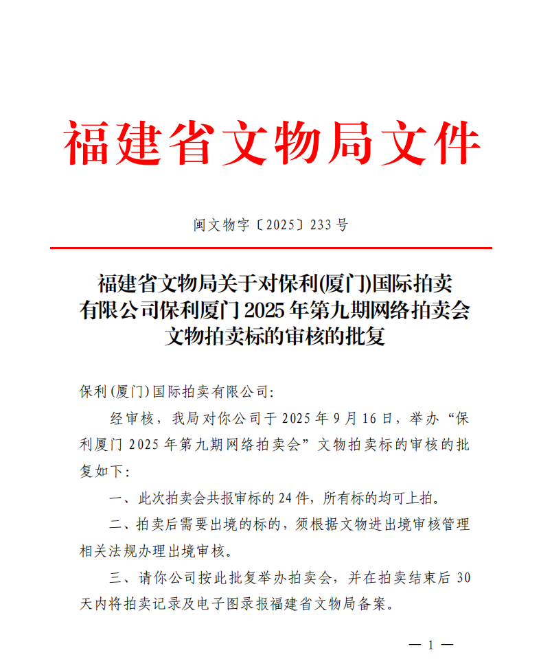 福建省文物局关于对保利(厦门)国际拍卖有限公司保利厦门2025年第九期网络拍卖会文物拍卖标的审核的批复