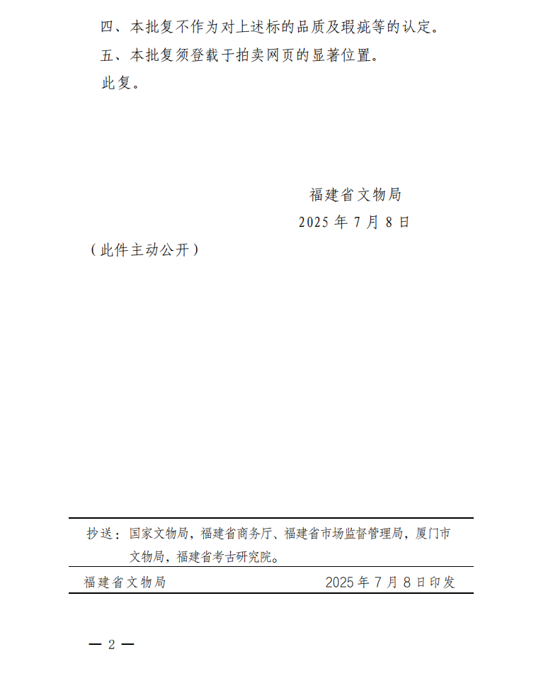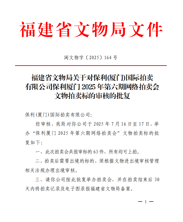 福建省文物局关于对保利(厦门)国际拍卖有限公司保利厦门2025年第六期网络拍卖会文物拍卖标的审核的批复