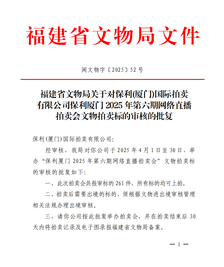 福建省文物局关于对保利(厦门)国际拍卖有限公司保利厦门2025年第六期网络直播拍卖会文物拍卖标的审核的批复