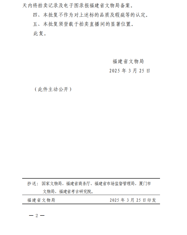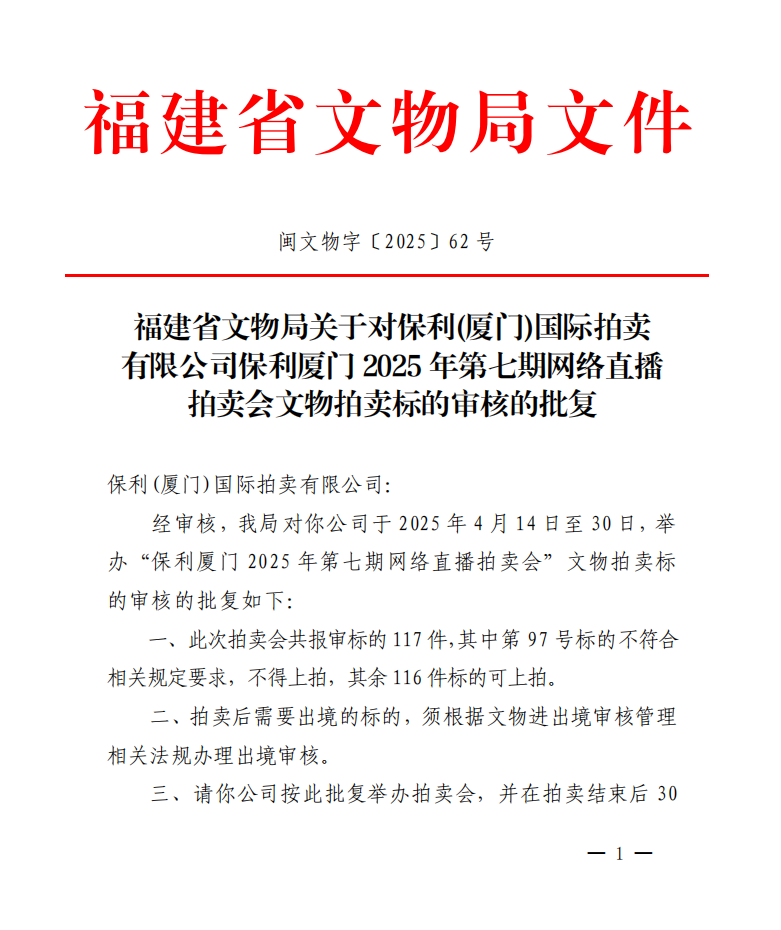福建省文物局关于对保利(厦门)国际拍卖有限公司保利厦门2025年第七期网络直播拍卖会文物拍卖标的审核的批复
