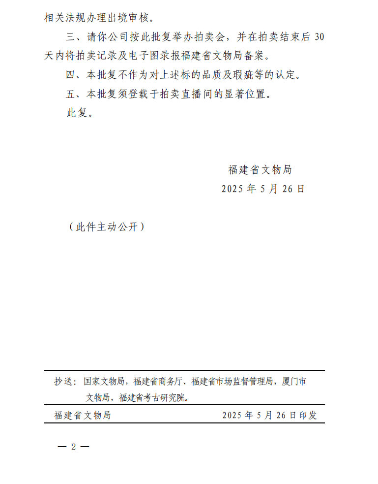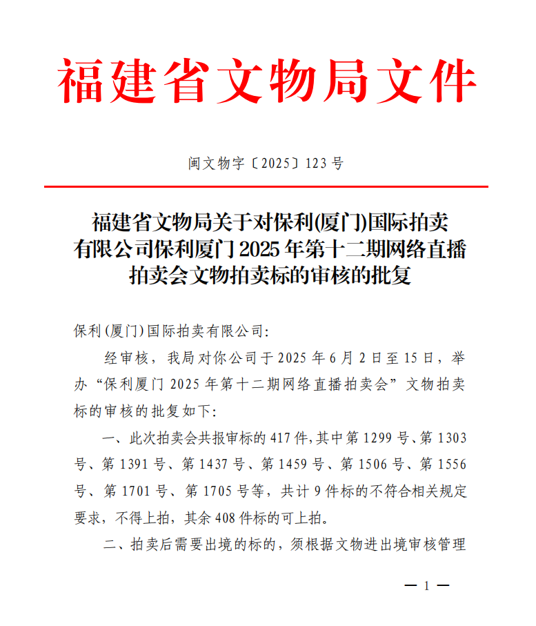 福建省文物局关于对保利(厦门)国际拍卖有限公司保利厦门2025年第十二期网络直播拍卖会文物拍卖标的审核的批复